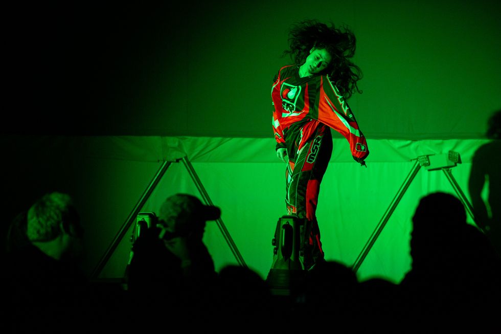 Bang. Projected onto the convex ceiling of the dome, a car spun out in a roundabout on what seemed like an infinite loop. A buzzing score, composed by the boundary-edging Finn Keane, began to drone off of the walls. Other music played throughout was composed by umru, SOPHIE, and Cecile Believe.