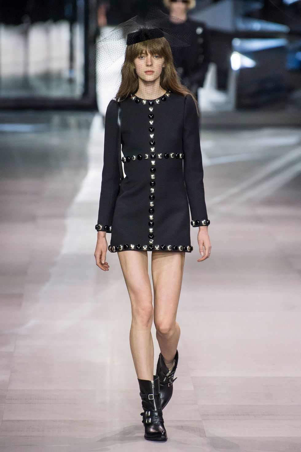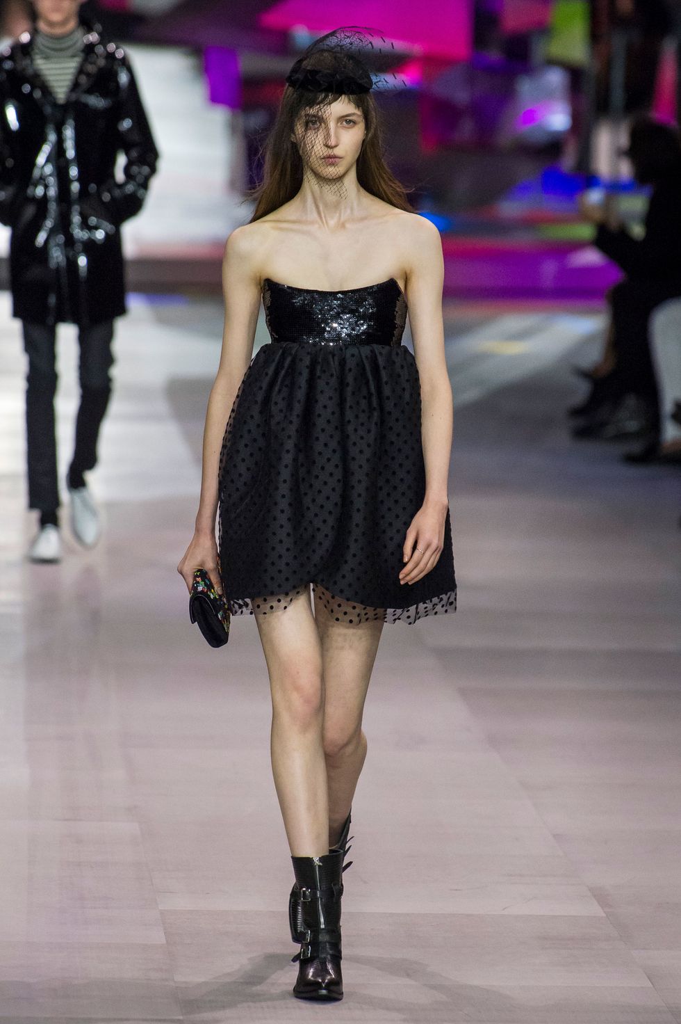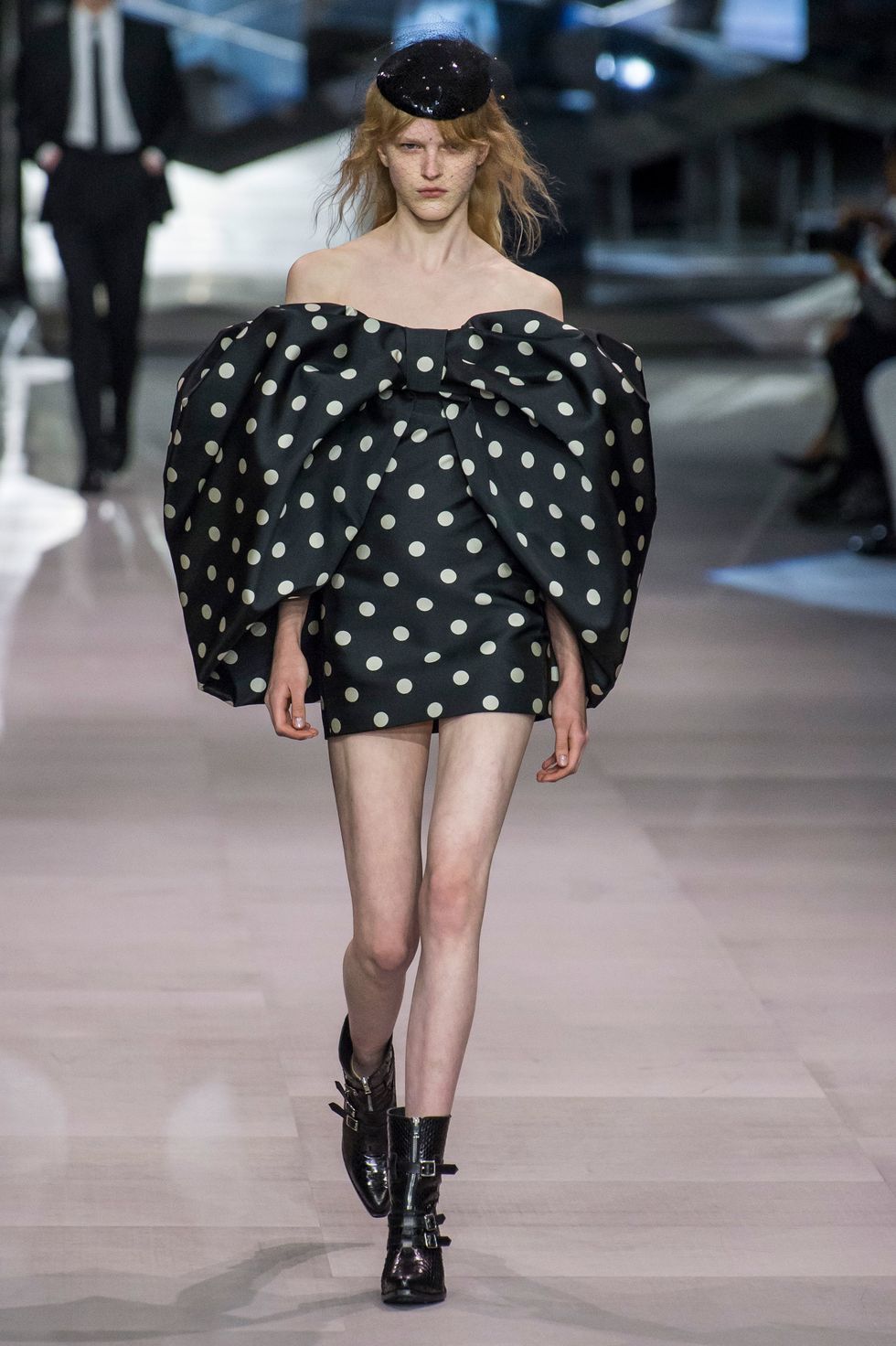 After a two-year hiatus since departing from Saint Laurent, Hedi Slimane has returned to runway. The designer debuted his first collection for Celine on a set that resembled the inside of a mirrored music box. His opening look — a strapless black cocktail dress covered in polka dots and enveloped in a giant bow — emerged from a glimmering installation like a wind-up ballerina. The show was bookended with drumming by two members of the French Republican Guard Band dressed in full, traditional regalia.
