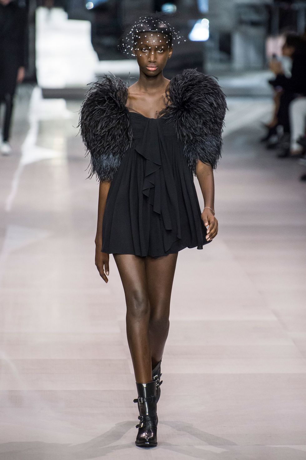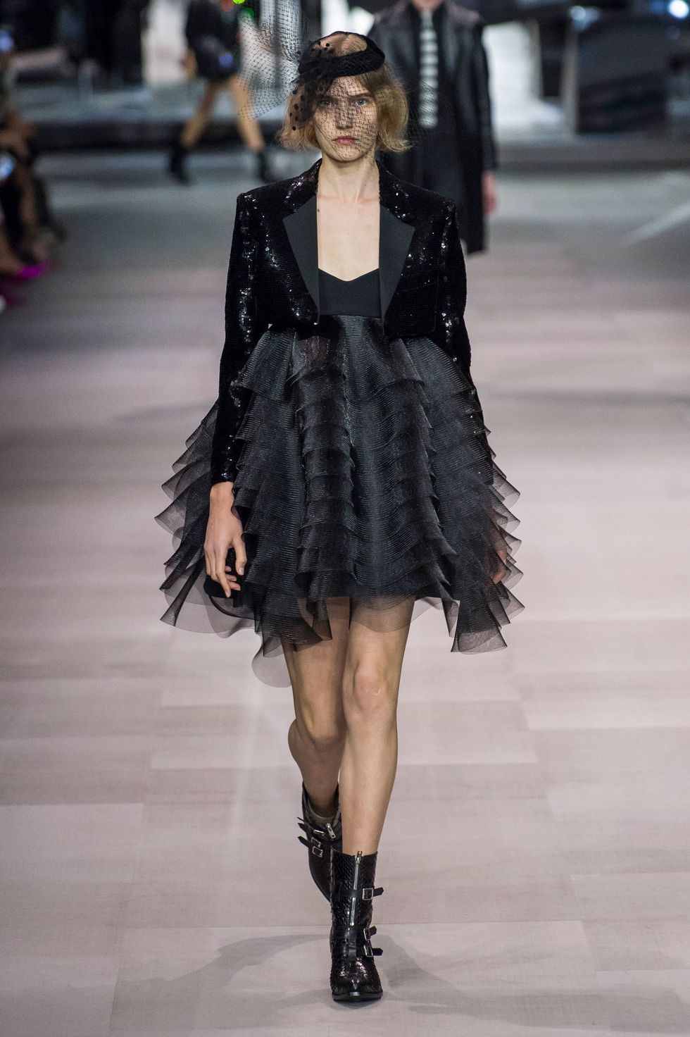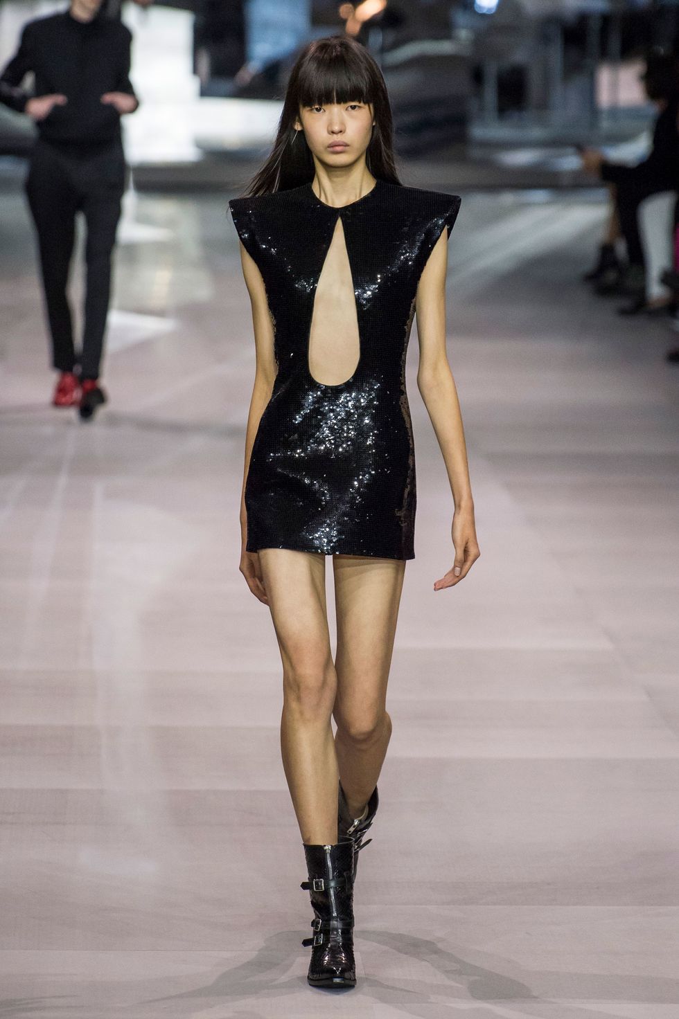 Celine hasn't seen hemlines this short since Michael Kors's tenure at the label in the late 1990s and early aughts. Dresses festooned with ruffles, multicolored sequin, and black lace — paired with broad-shouldered bolero jackets and stylized cowboy boots — just barely hit midthigh.