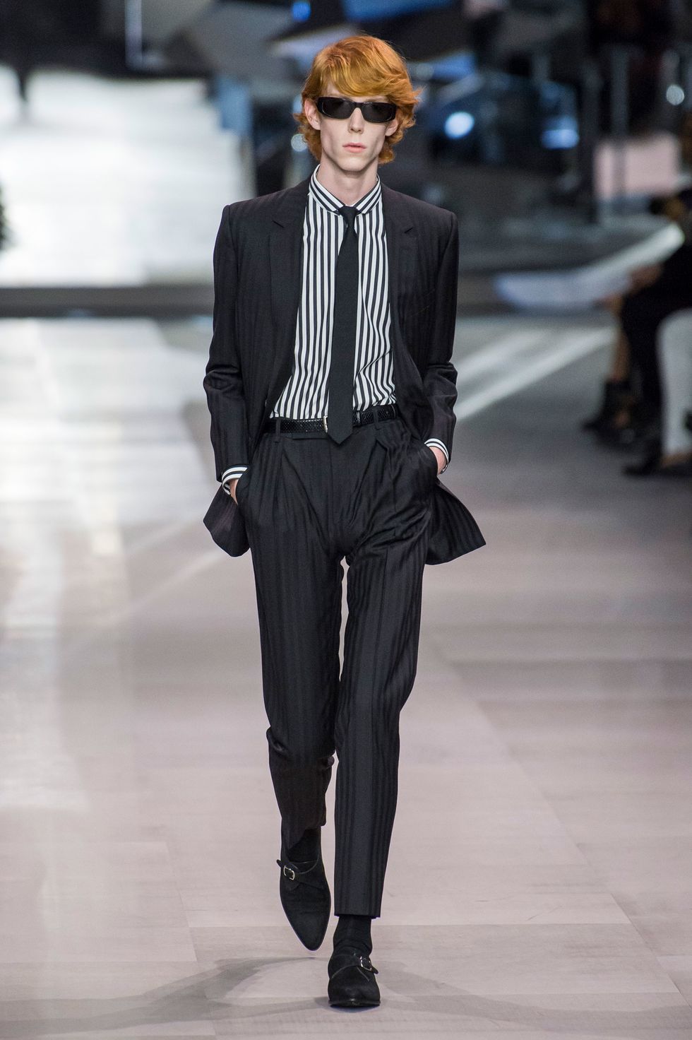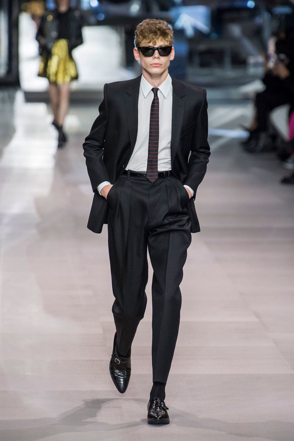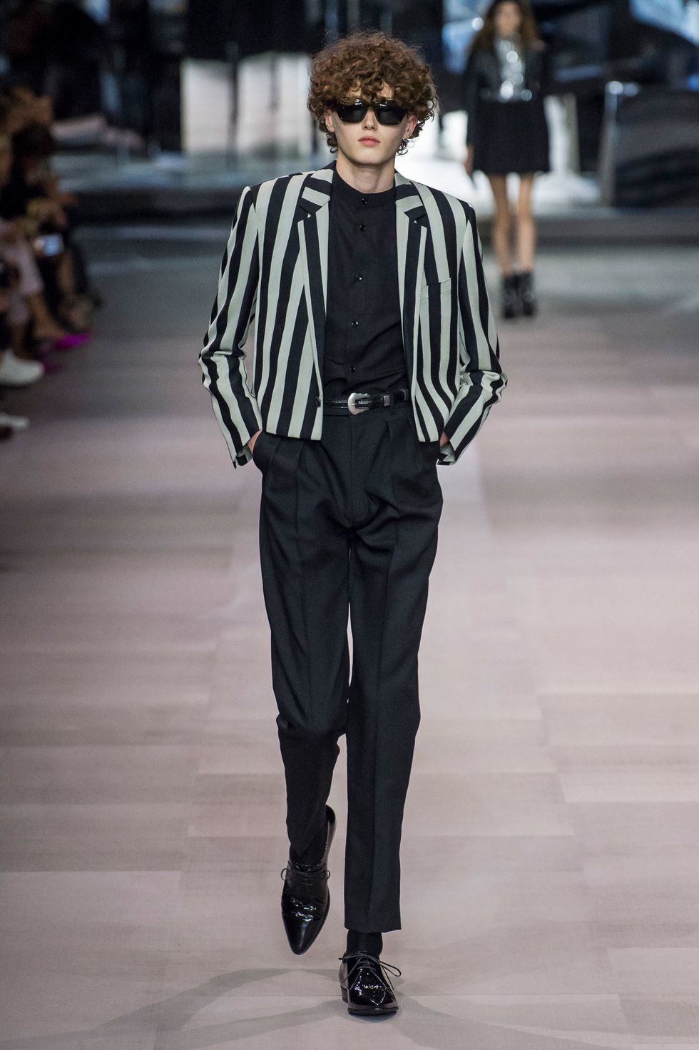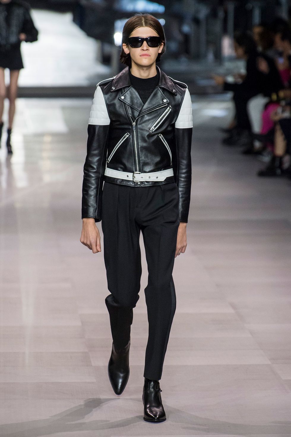 This collection also marks Celine's first foray into menswear. Breton stripe jumpers, skin-tight slacks, satin bomber jackets, and sharply tailored "le smoking" suits a la Yves Saint Laurent dominated the men's line up. The predominantly jet-black ensembles, with occasional touches of red, white, blue, and gold, evoke slick versions of Agents K and J from Men In Black.