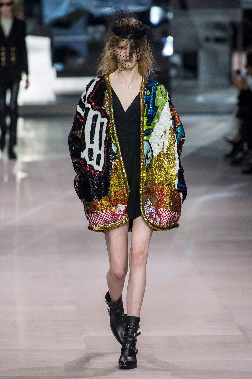 Slimane partnered with visual artist and composer Christian Marclay this season. Works by the Swiss-American creative including paintings and comic book collages were translated to glittering embroideries, stark black-and-white prints, and patches in the collection.