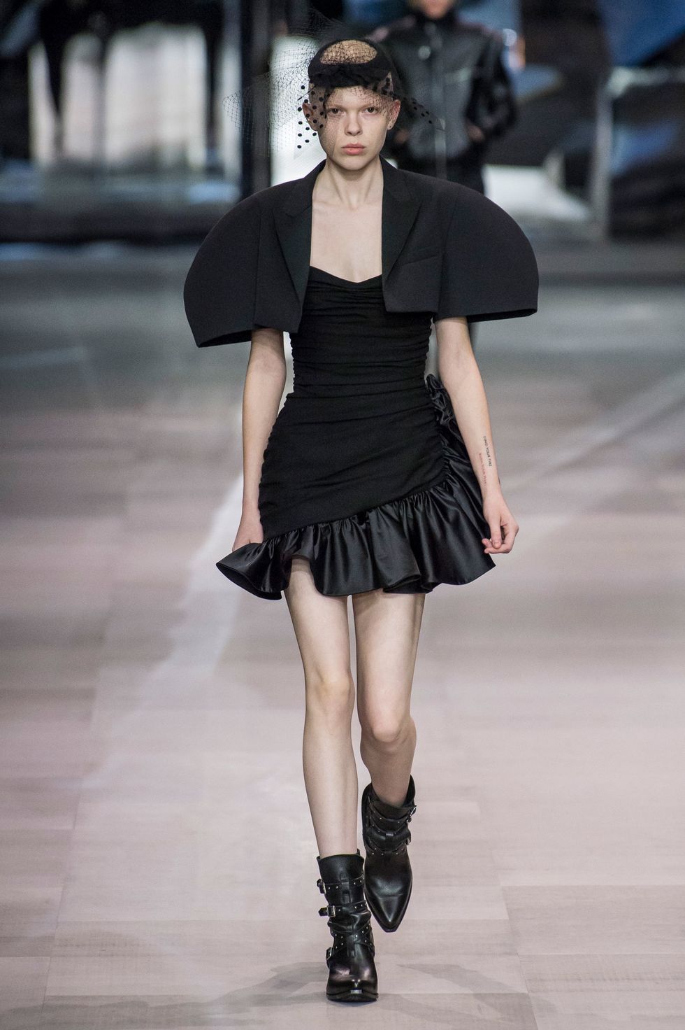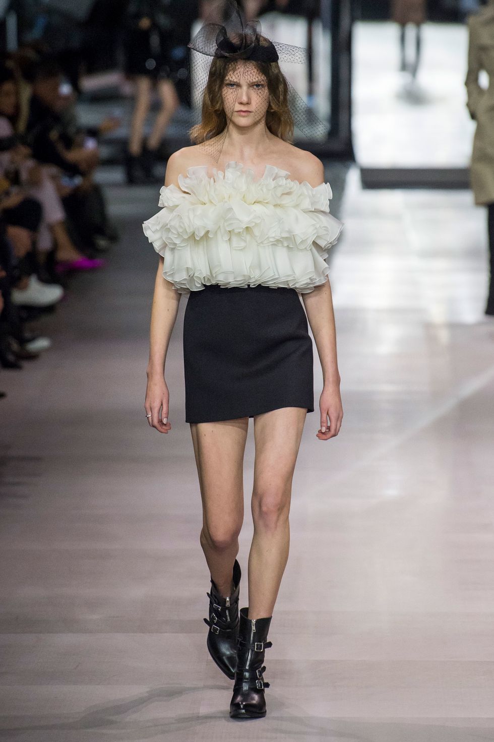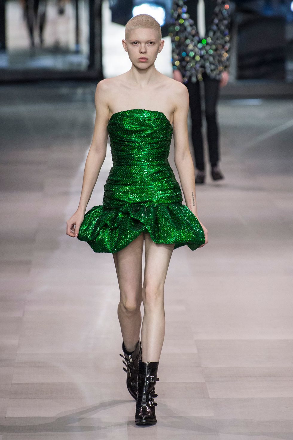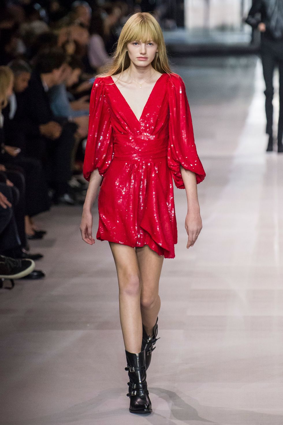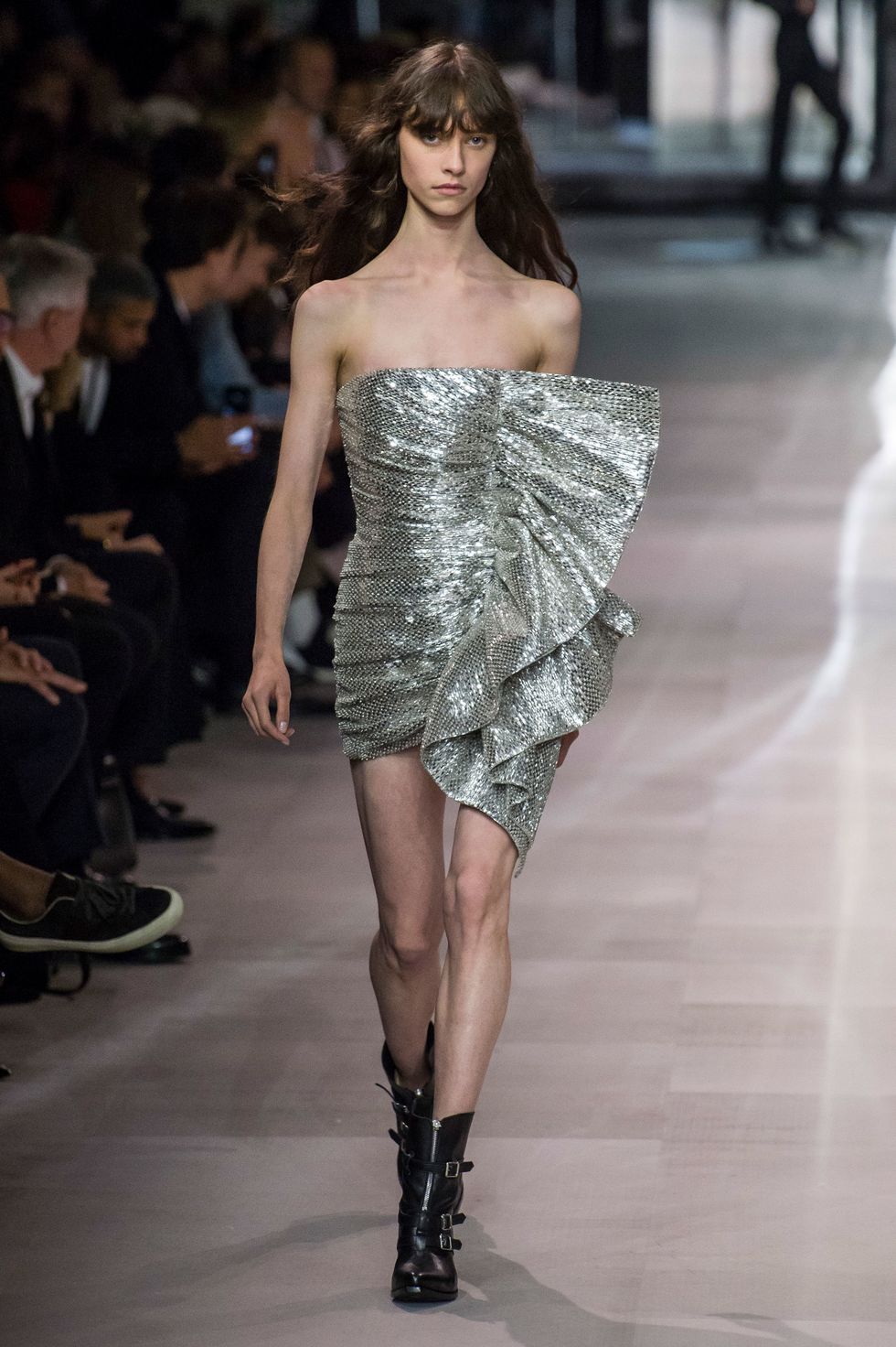 Celine hasn't seen hemlines this short since Michael Kors's tenure at the label in the late 1990s and early aughts. Dresses festooned with ruffles, multicolored sequin, and black lace — paired with broad-shouldered bolero jackets and stylized cowboy boots — just barely hit midthigh.