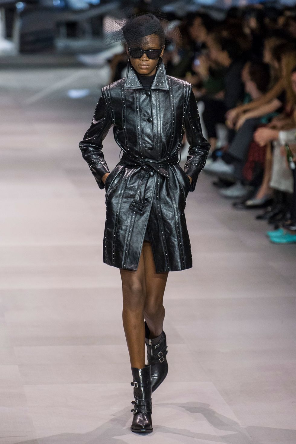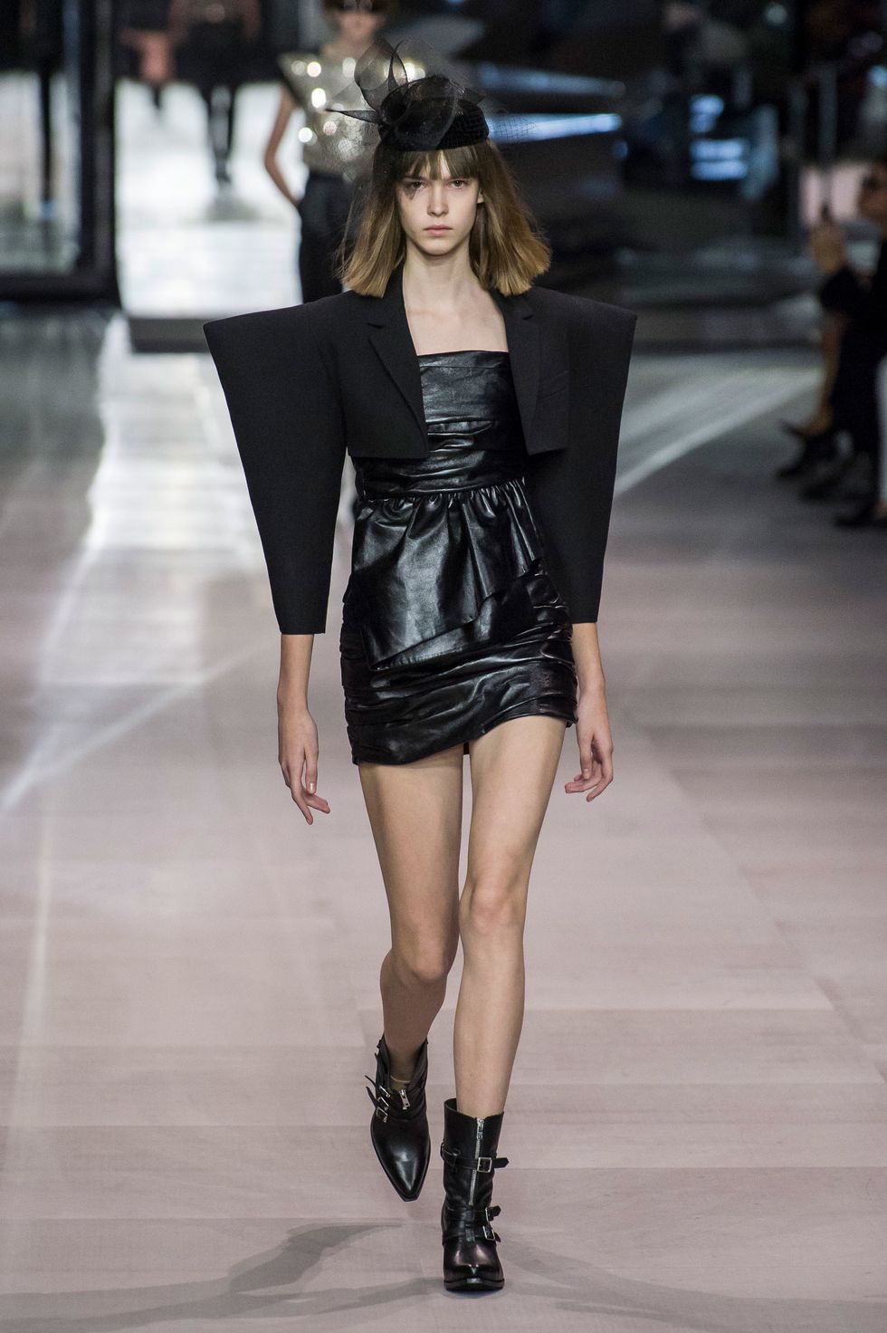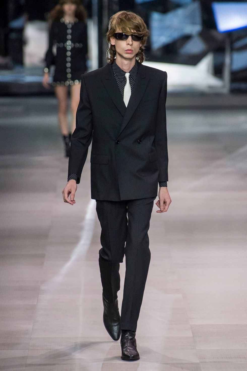 After a two-year hiatus since departing from Saint Laurent, Hedi Slimane has returned to runway. The designer debuted his first collection for Celine on a set that resembled the inside of a mirrored music box. His opening look — a strapless black cocktail dress covered in polka dots and enveloped in a giant bow — emerged from a glimmering installation like a wind-up ballerina. The show was bookended with drumming by two members of the French Republican Guard Band dressed in full, traditional regalia.