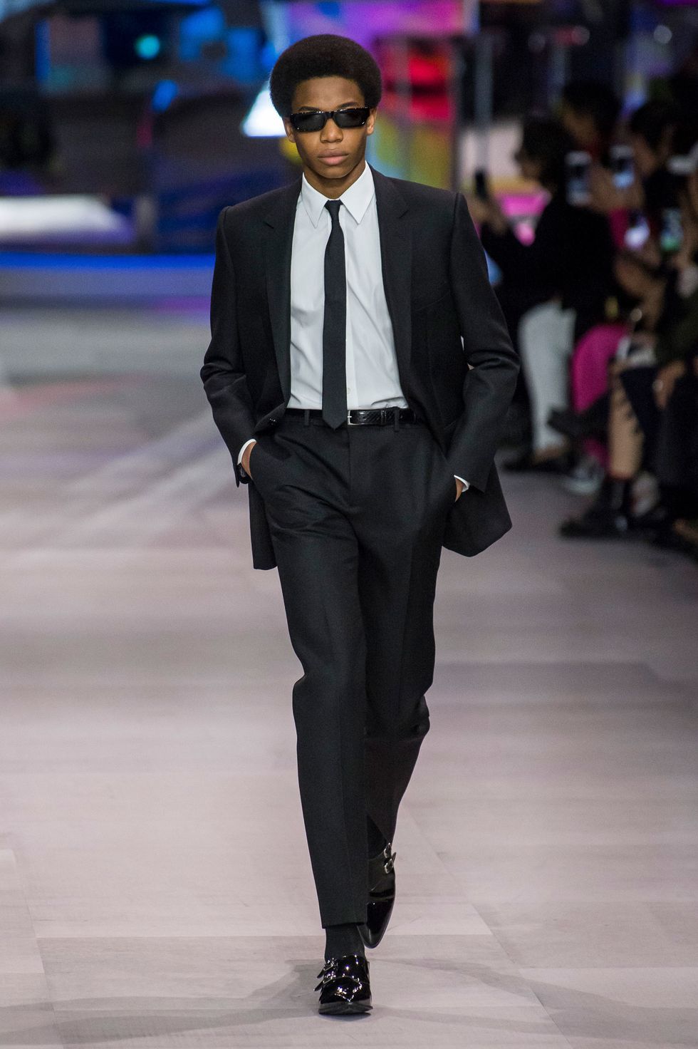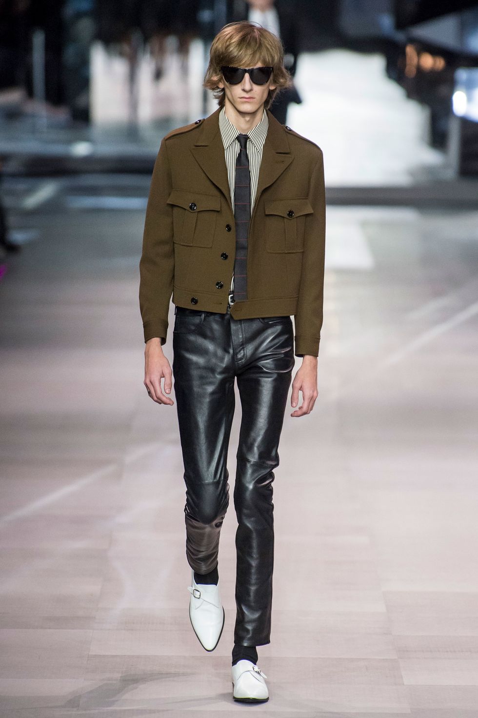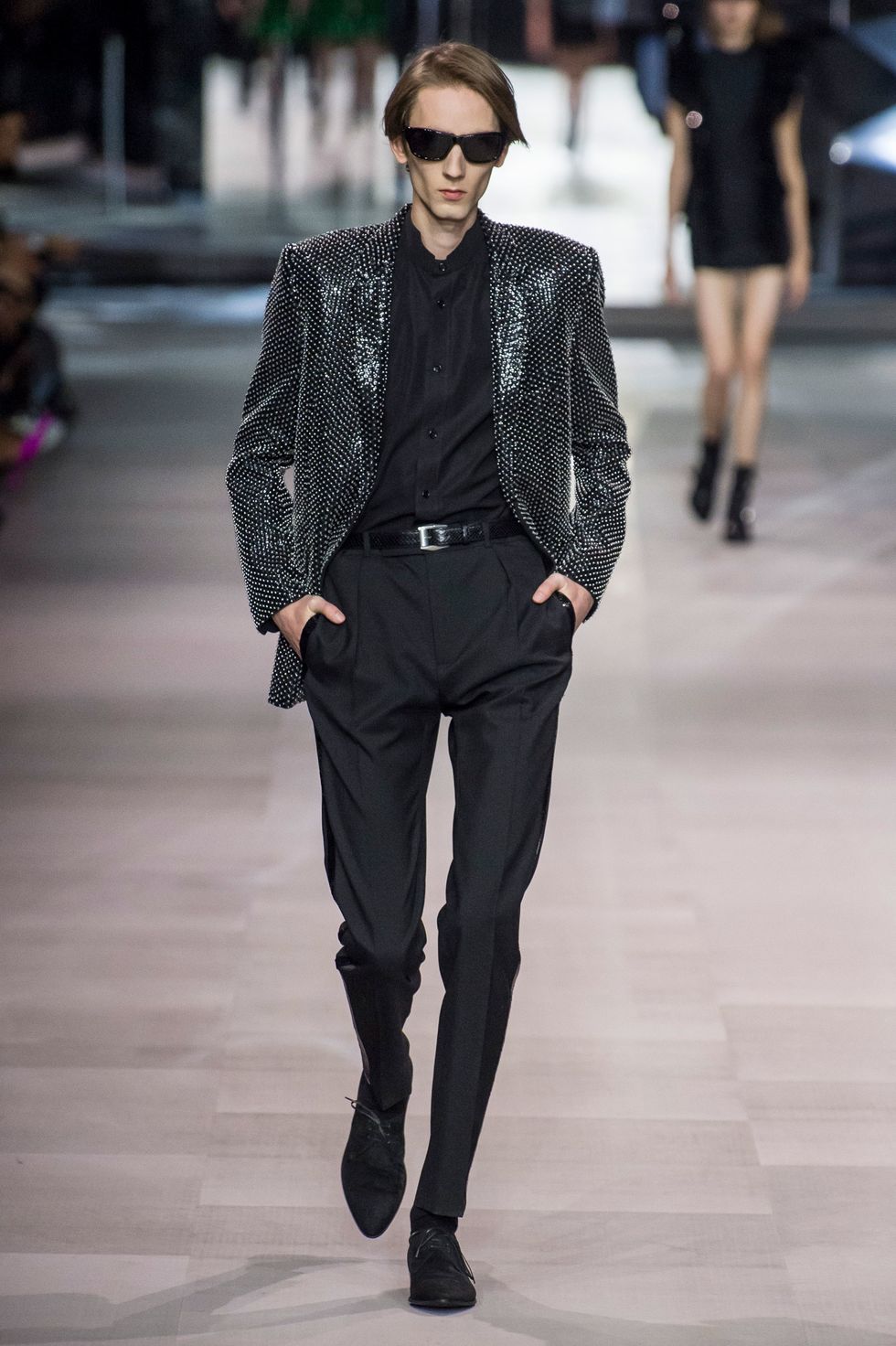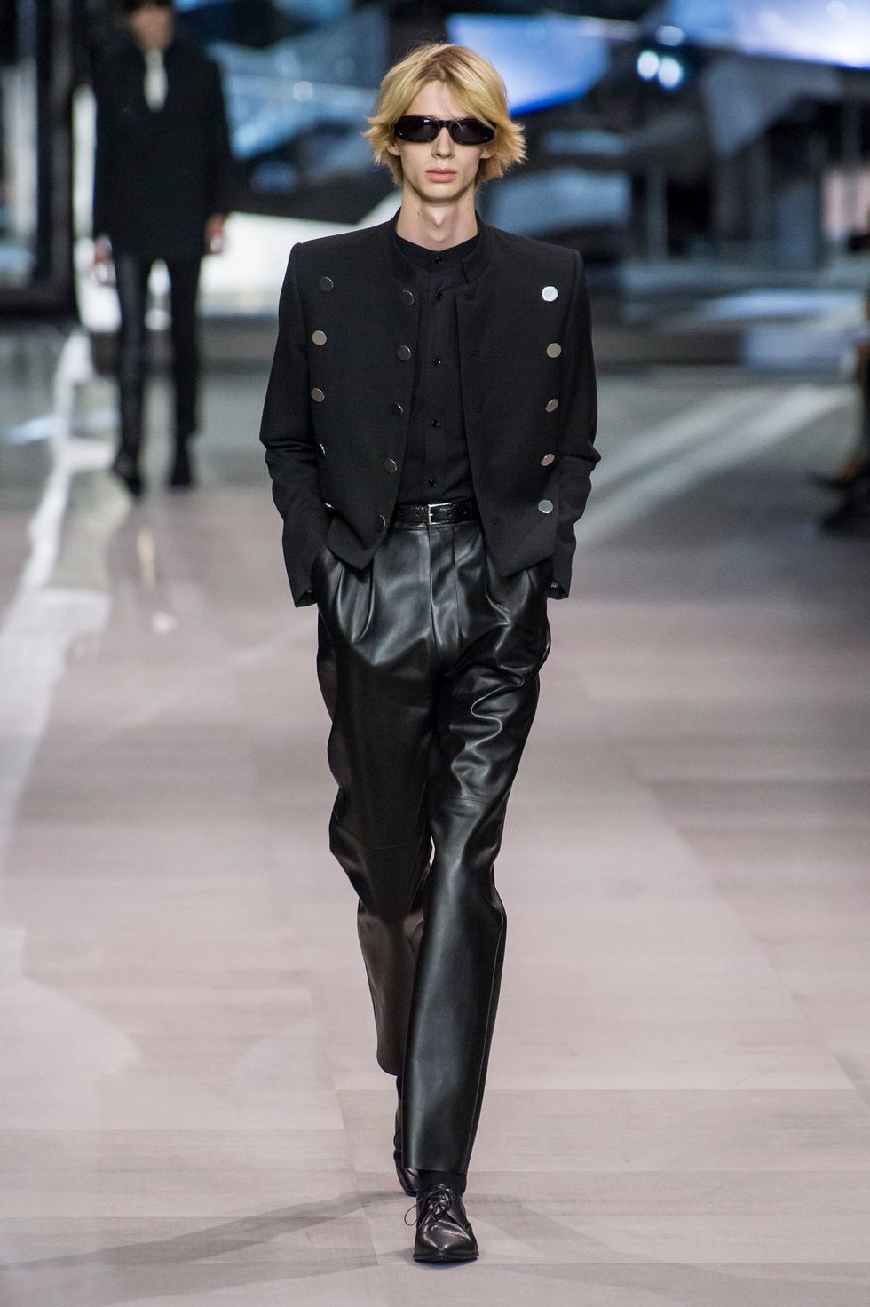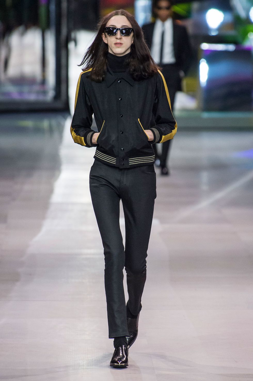 This collection also marks Celine's first foray into menswear. Breton stripe jumpers, skin-tight slacks, satin bomber jackets, and sharply tailored "le smoking" suits a la Yves Saint Laurent dominated the men's line up. The predominantly jet-black ensembles, with occasional touches of red, white, blue, and gold, evoke slick versions of Agents K and J from Men In Black.