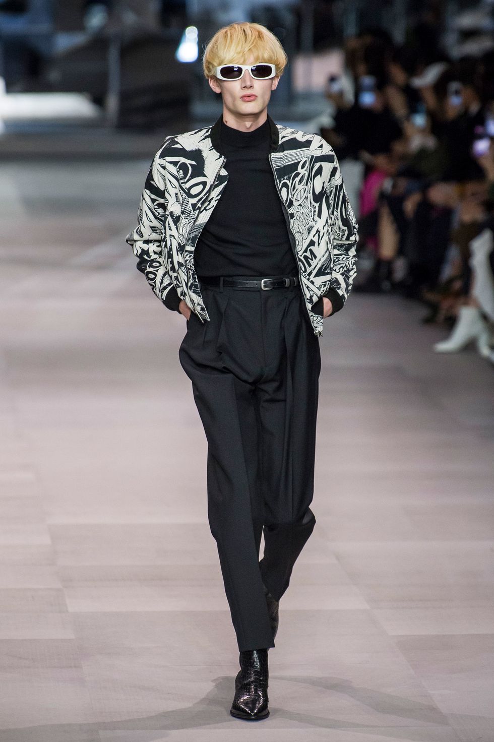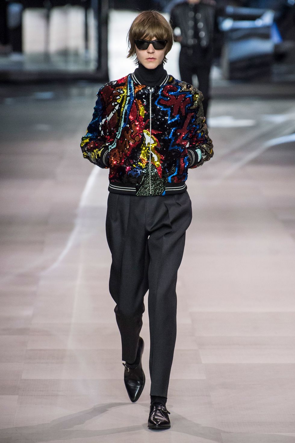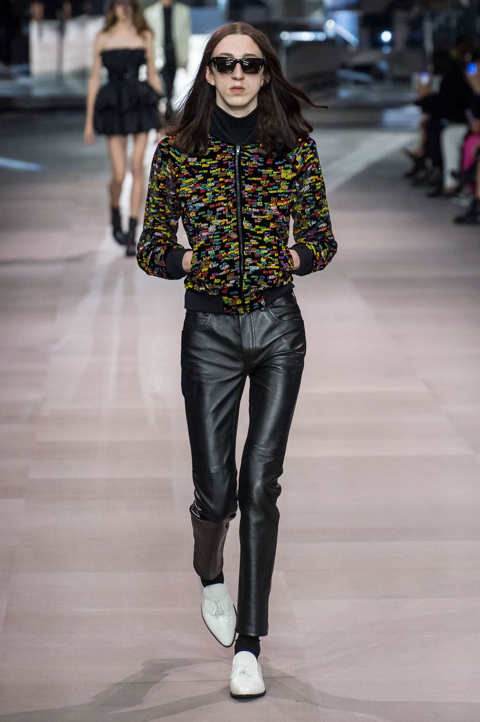 Slimane partnered with visual artist and composer Christian Marclay this season. Works by the Swiss-American creative including paintings and comic book collages were translated to glittering embroideries, stark black-and-white prints, and patches in the collection.
