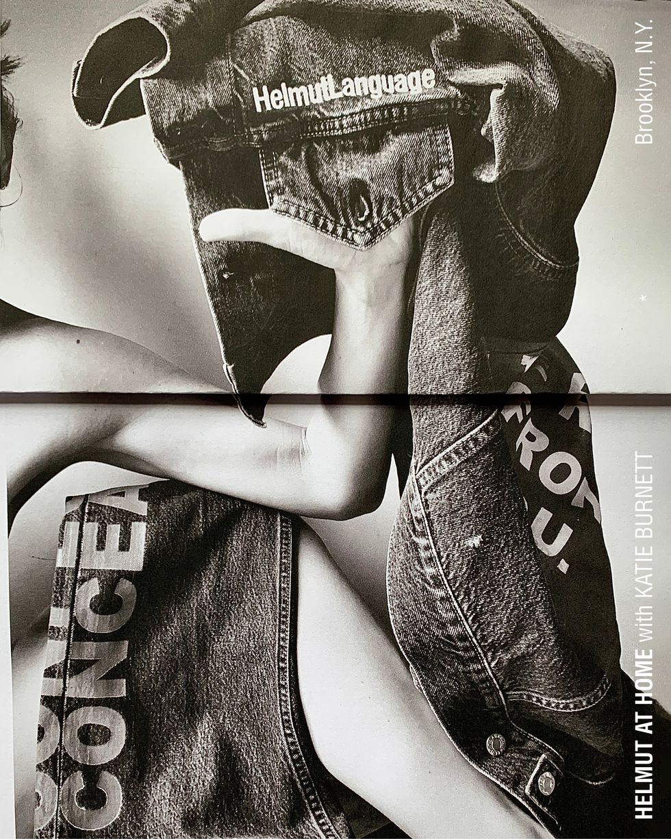 The collection, called "Helmut Language," was released last month and consists of core items like trucker jackets and hoodies made from deadstock materials with large, bold graphics and phrases. Burnett's images highlight some of the key phrases, such as "CONFESS CONCEAL" and "THE WORDS ARE RIGHT IN FRONT OF YOU" (all part of Norris' text-based design aesthetic).