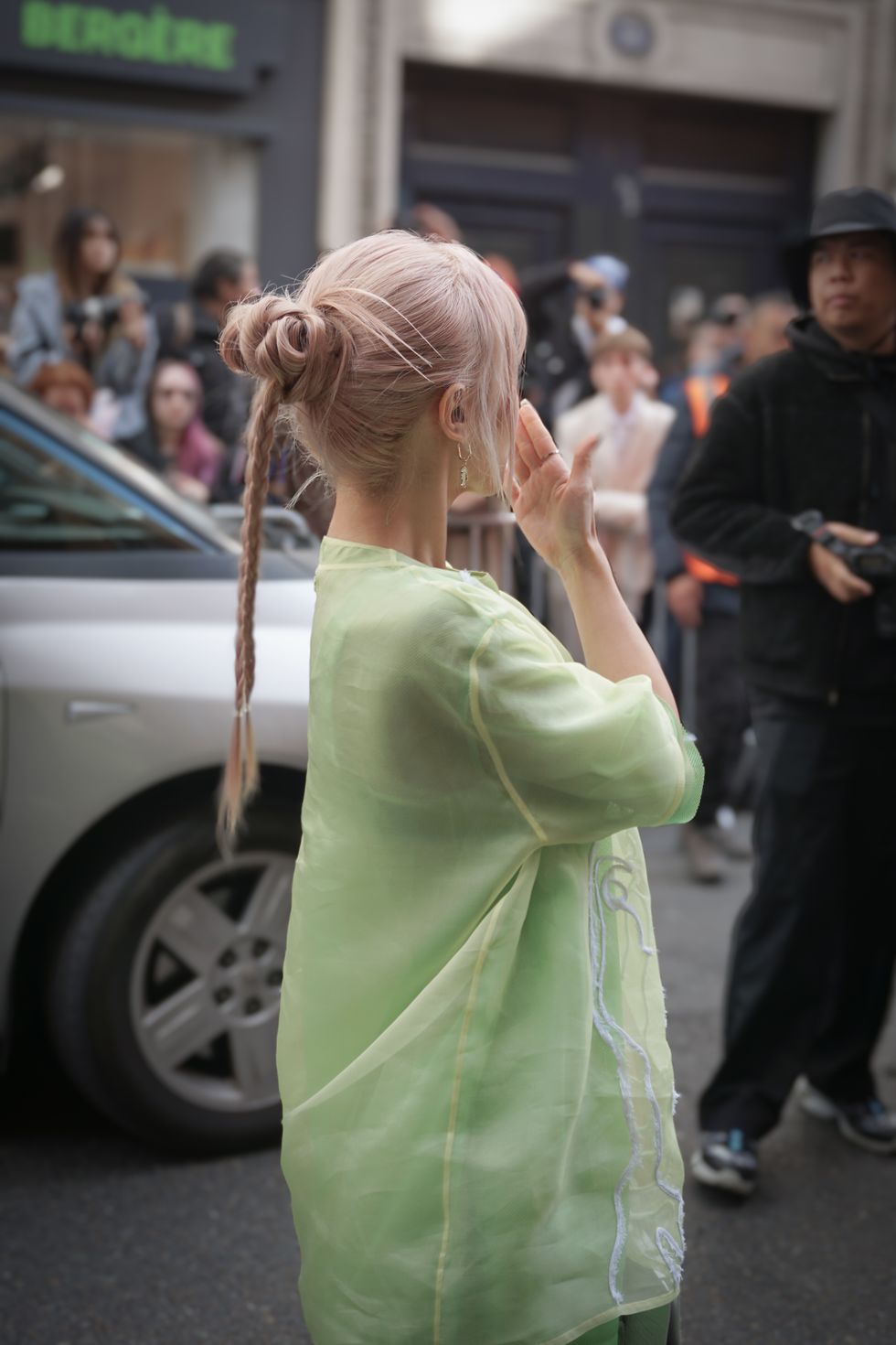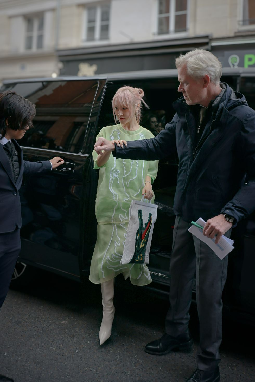 HEYOON wore head-to-toe Spring 2025 Lacoste: a delicate mint green set, with the iconic crocodile embroidered across the front. Her leather bag featured the same illustration, modeled after a vintage Lacoste shopping bag sourced and reimagined by Lacoste Creative Director Pelagia Kolotouros. Finished with dangling logo earrings, cream leather boots and HEYOON’s soft pink hair gently framing her face, the international performer looked perfect for the occasion.