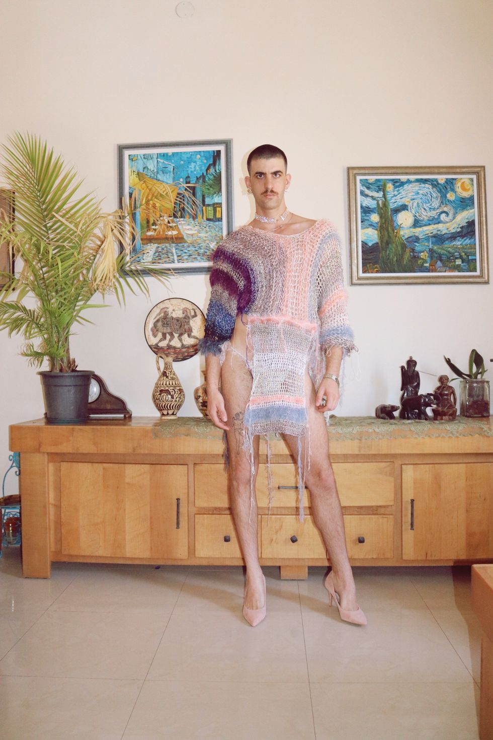 For the past 10 years I have lived in Tel-Aviv, and last march I moved back to the town I grew up in, due to COVID-19. It's a small town in the Israeli Southern District. As a born and raised Israeli gay nonbinary individual, it wasn't easy growing up in a country that knows so much war. Hyper-masculinity is common because of cultures merging — aggressively sometimes — and the fact most citizens are obligated to serve the army. I could sense the pressure of performing masculinity since kindergarten, and it followed me through high school and straight to my military service.