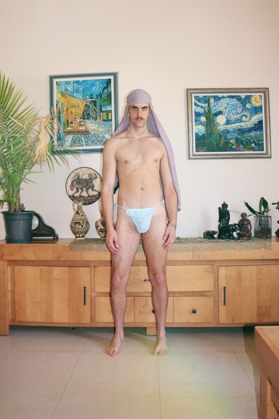 "Every piece is customized, material and color-wise, detailed with pearls and crystals," Haken says of their designs, available to order online. "It is not very common celebrating the male body in that way: unthreatening and non-aggressively, with soft colors and soft textiles."