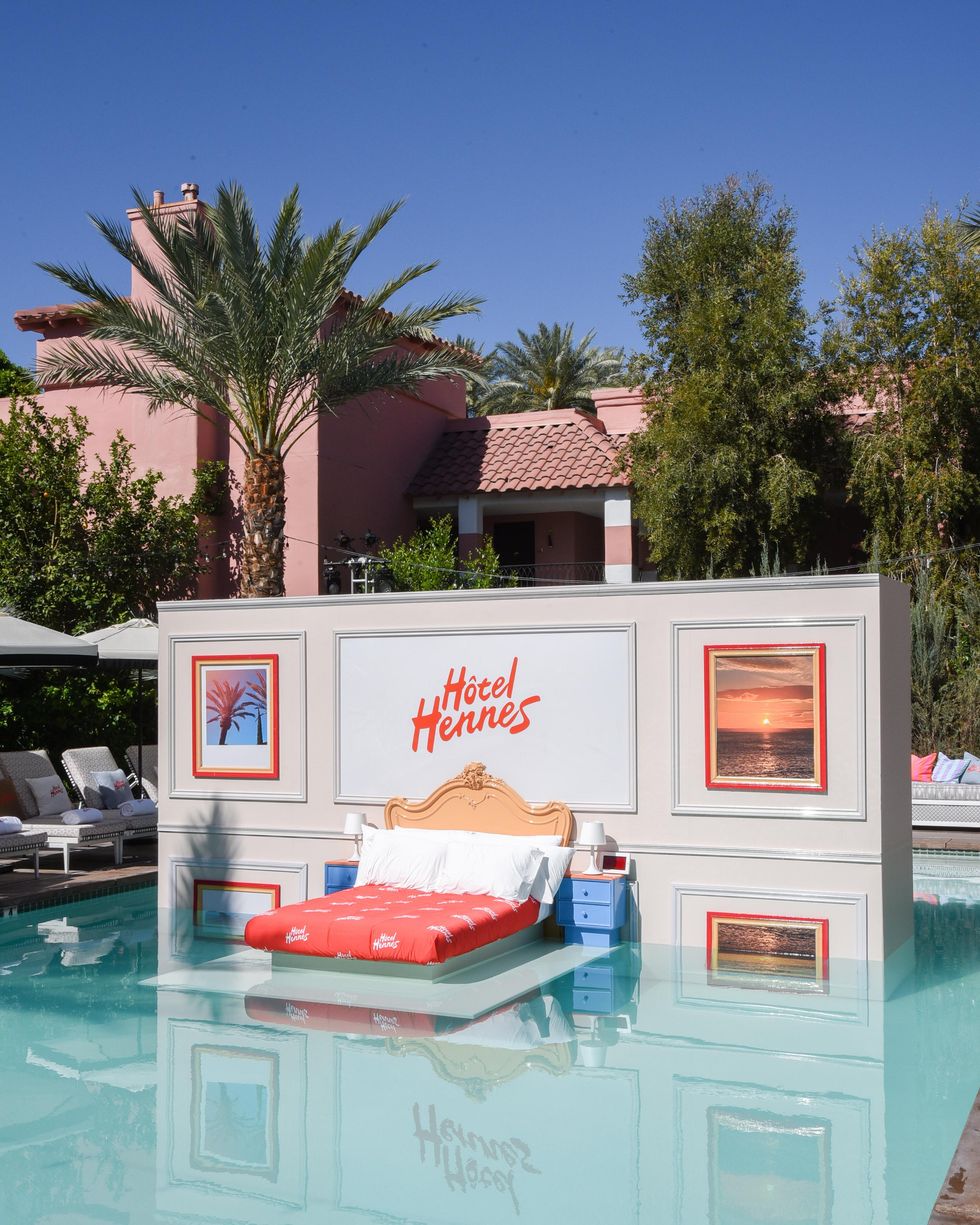 H&M chose the Sands Hotel & Spa in Indian Wells (located between Palm Springs and Indio, CA) for the IRL transformation, which included bellhops in H&M-branded uniform and recreated hotel room in the middle of the swimming pool complete with a Hotel Hennes mattress and pillows. There was also a styling suite with racks of pool-ready H&M gear.