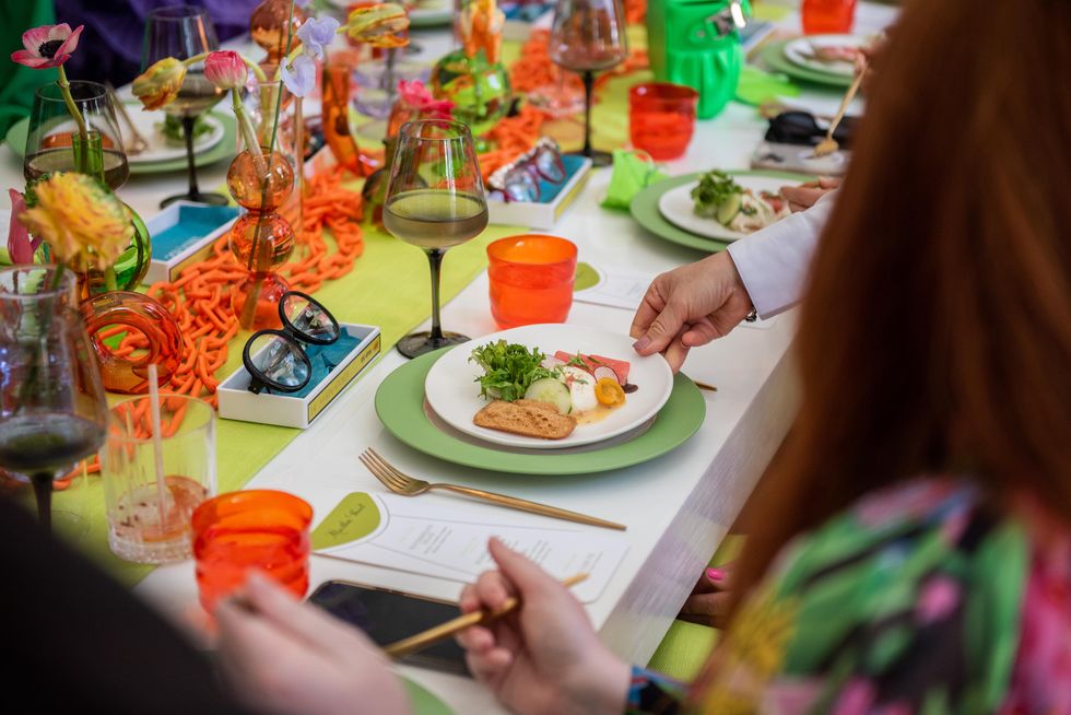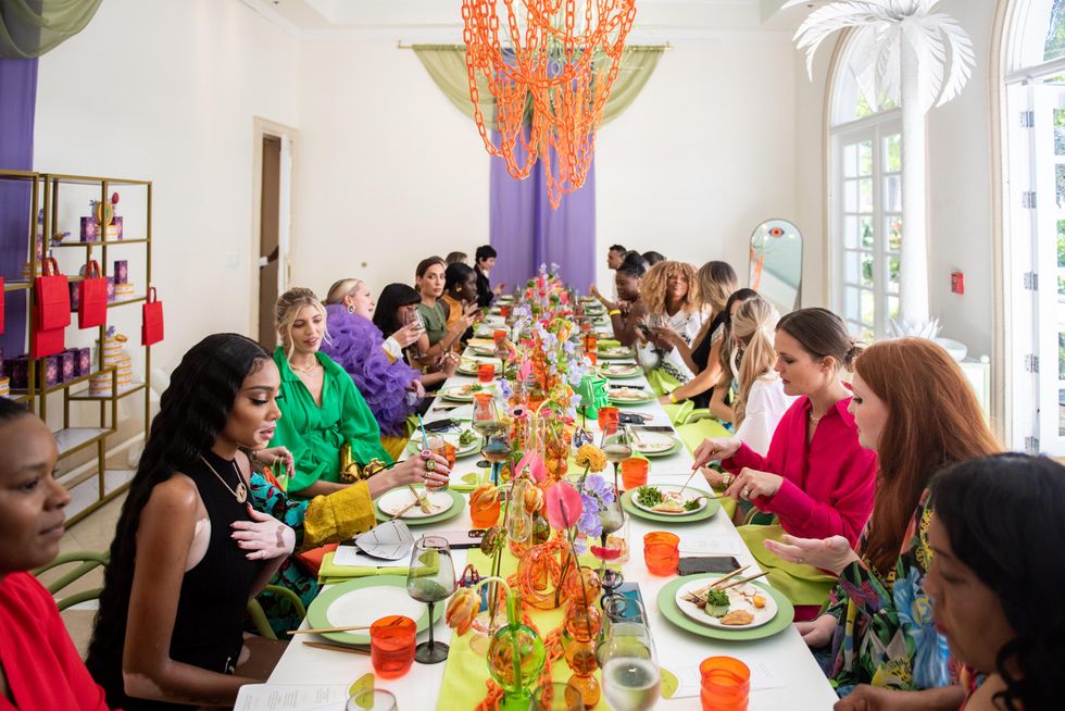 After an outdoor cocktail hour on the hotel’s poolside lawn, guests made their way inside the Solarium where a hologram of Apfel greeted everyone before being seated at the colorful tablescape complete with sculptural accents and vibrant flowers.