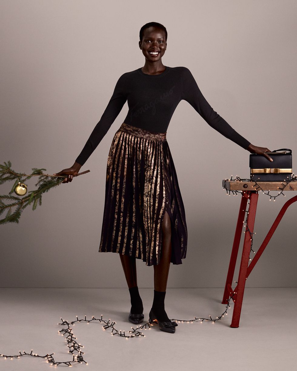 Metallic sneakers, leather bracelets, botanical printed satchels and sweaters, and 'Viva' bags in matte red, black and gold are festive brand standouts. They're complemented by the house's classic bow-topped flats and heels, as well as loafers, wallets and belts emblazoned with its sleek Gancini logo. Add some of the latest Ferragamo tailored separates, silk dresses and knits to gifting list and you'll have holiday-ready ensembles everyone will want to find under their trees this season.