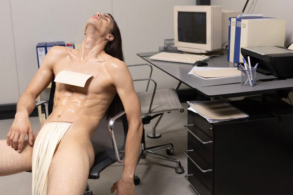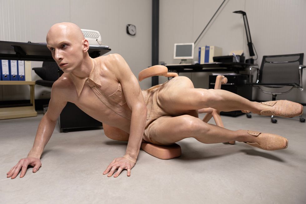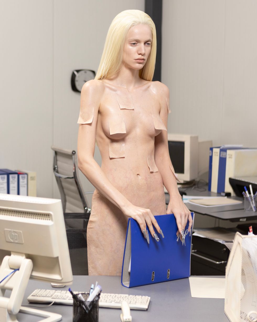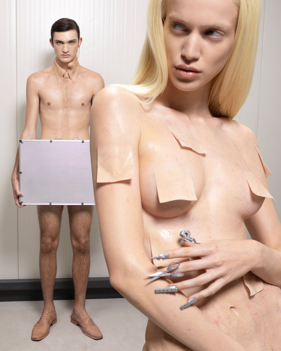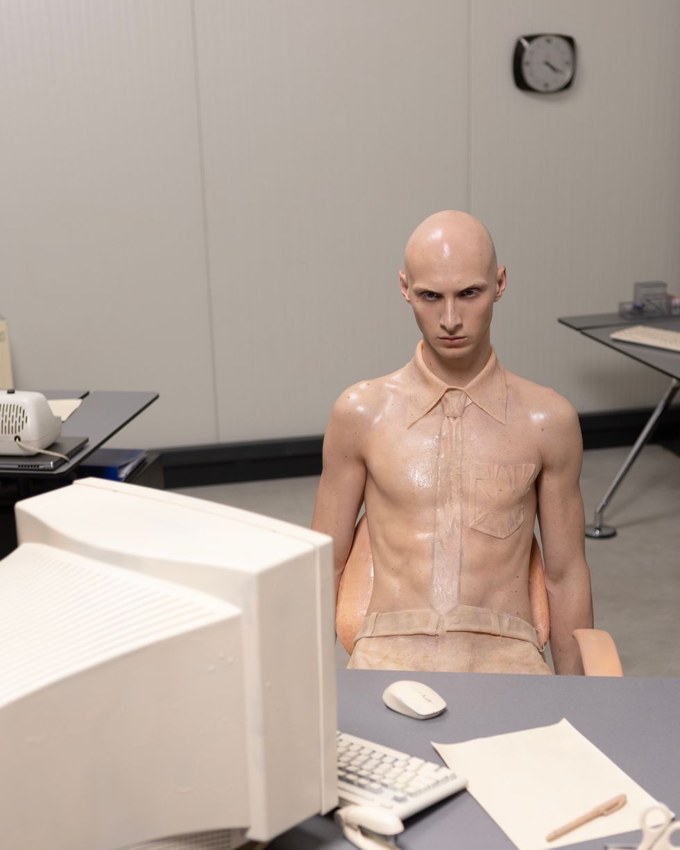Dreamt up by photographer Marko Suvić, this bodies of this new species melds with office attire, supplies and furniture, blurring the line between human and tool. Skin-like uniforms of collared shirts and ties, as well as objects like Post-it notes and swivel chairs, extend the bodies, creating a world of surrealism and body horror.
