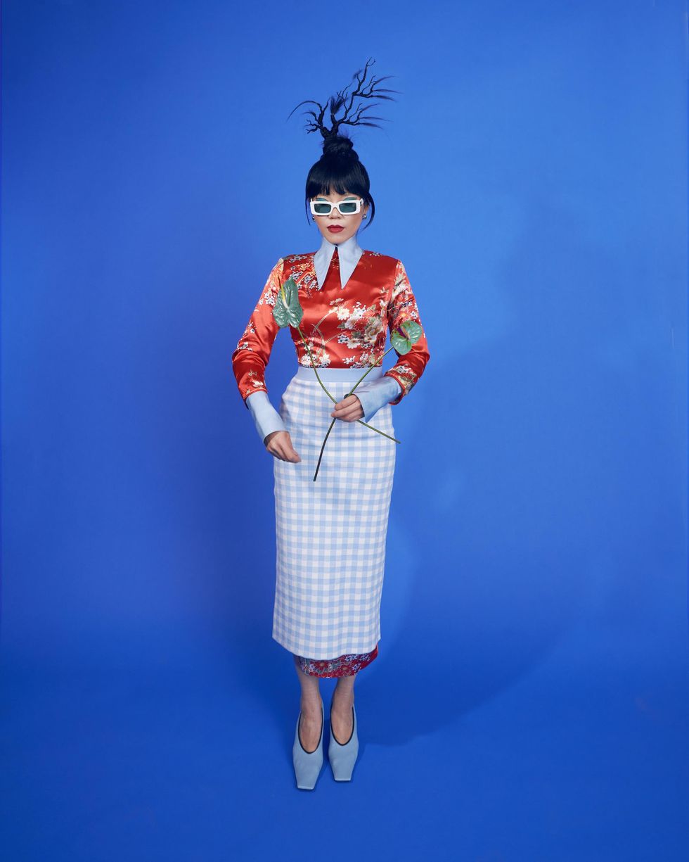 Sunglasses: Off White, Earrings: Shop Dela, Gold Blouse: Gucci, Qipao: Ruby's own, Skirt: Alessandra Rich, Shoes: Bottega Veneta