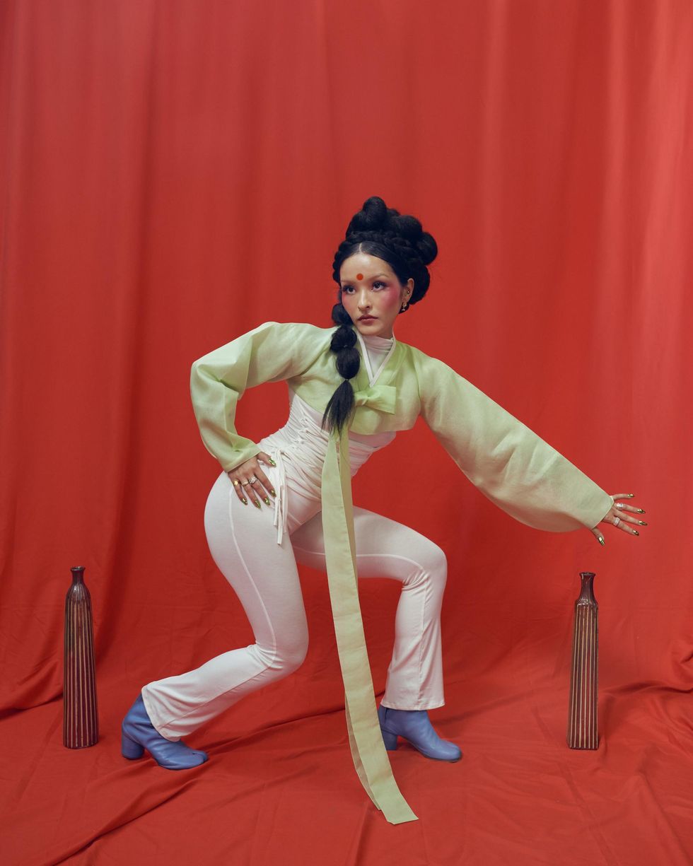 Earrings: Heji's own, Rings: Heji's own, Hanbok: Heji's own, Top: Thursday Party, Bottoms: Thursday Party, Shoes: Maison Margiela