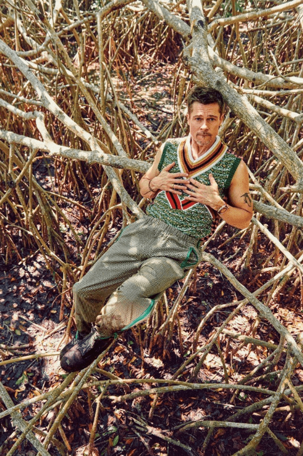 Well, would you look at that. While our backs were turned Harry Styles and Brad Pitt, who have both garnered a ton of attention of late, became the same person. Brad's GQ cover story made headlines yesterday for its mutual absurdity and depth and featured a photo shoot with Brad in America's national park which was mutually very absurd and very deep. Harry has had a string of covers after launching his solo career, the first of which being for Another Man.