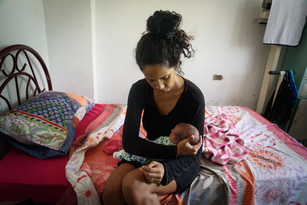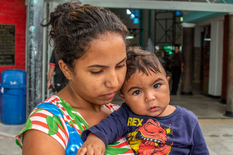 Venezuelan Emaivis and her baby Leonal stand outside the bus terminal in Barranquilla.