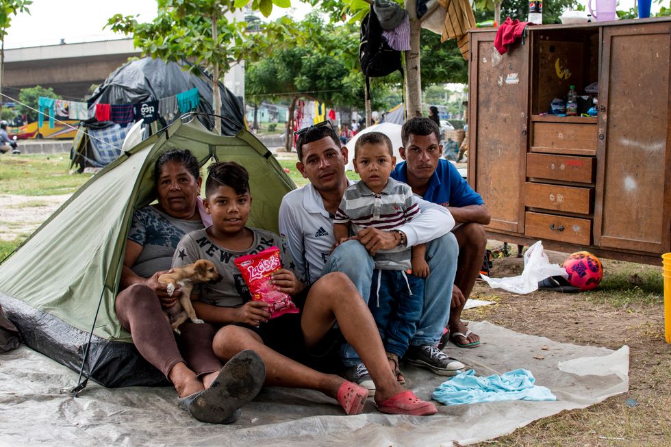 A Venezuelan family sits in a tent where they have lived for 20 days. The children sleep inside the tent while the adults sleep out in the open.