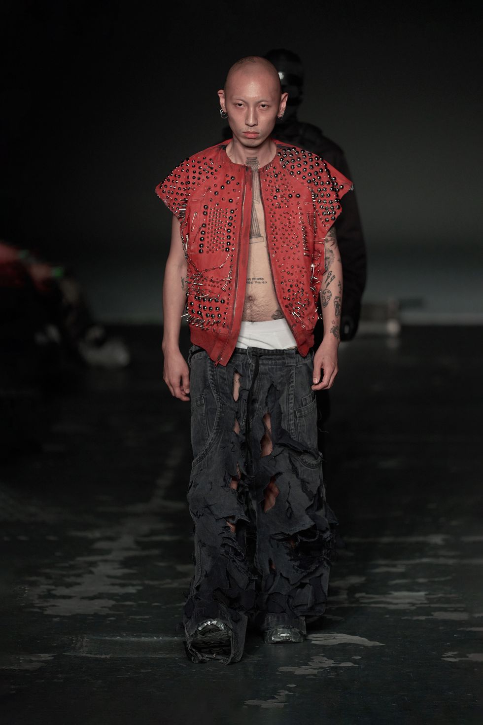 That ethos guided HYACYN’s latest collection, unveiled in Brooklyn during New York Fashion Week. Ulmer titled it "Sturm und Drang" after the 18th-century German literary movement that shaped his hometown and childhood. He remembers reading Friedrich Schiller in school and growing up surrounded by castles and history, where rebellion felt embedded in the landscape. For Ulmer, it became a lifelong question of authenticity: Who am I? Who are we? What are we doing here? The show staged those questions through clothes that swung between structure and collapse: strict leather tailoring offset by raw edges, fluid trousers dragging into heavy boots, distressed graphics scrawled across otherwise refined silhouettes.