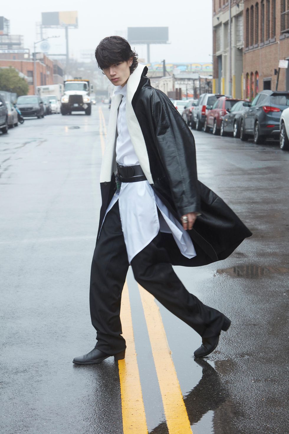 Coat: Pier Antonio Gaspair (Showroom Seven), Shirt: Graham Tyler, Tuxedo Pants: Saint Laurent, Belt: Alexander McQueen, Accessory Pin on Belt: Erickson Beamon (Showroom Seven), Boots: Junn. J