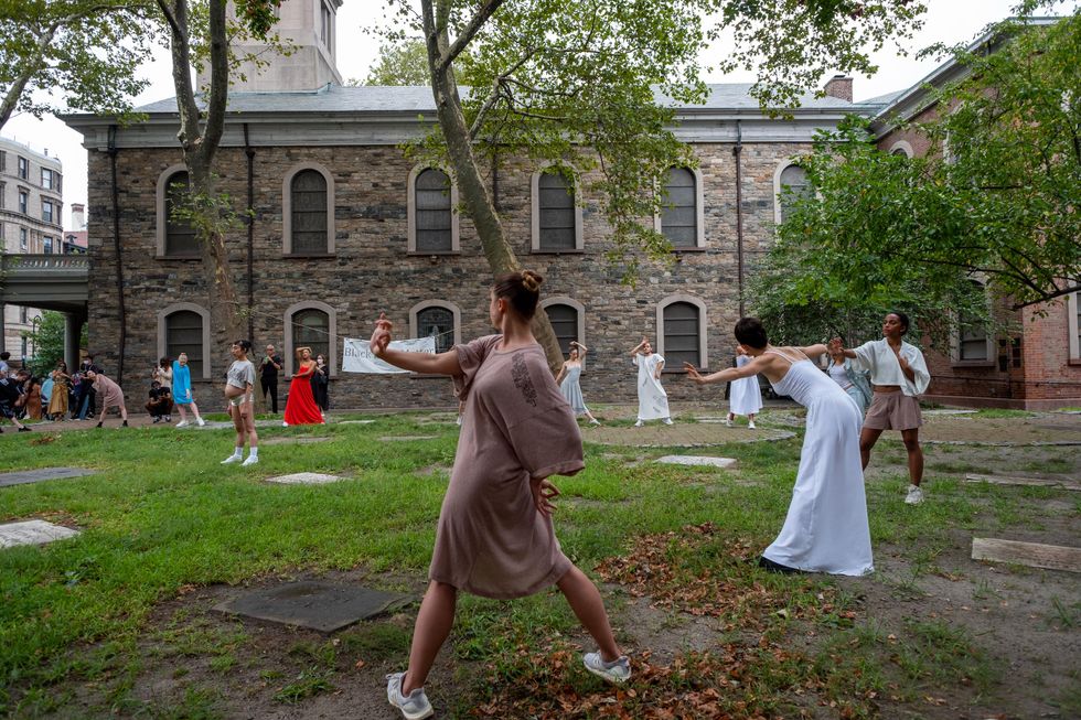 This season, Subkoff held her show at St. Marks Church in downtown Manhattan, where editors, eco-warriors and friends of Subkoff were ushered outside to a courtyard for the first portion of the show. On a grassy knoll, as a singer in black softly sang a haunting sonnet about human kindness and rebirth, dancers performed a modern piece, each wearing a red, white or blue recycled cotton outfit with activist slogans embroidered onto the garment. A particularly powerful message on a floor length white kaftan, worn by Rosenaldo Benitez, read, "If love is under siege, it is because it threatens the very essence of commercial civilization."