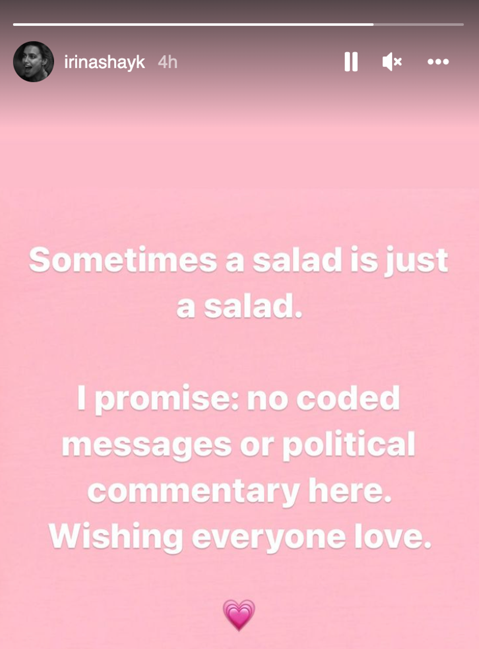 Shayk, who has a child with Bradley Cooper, took to Instagram Stories again to clarify her original post in the wake of the internet outrage. "Sometimes a salad is just a salad," she wrote in white letters against a pink background. "I promise: no coded messages or political commentary here. Wishing everyone love."