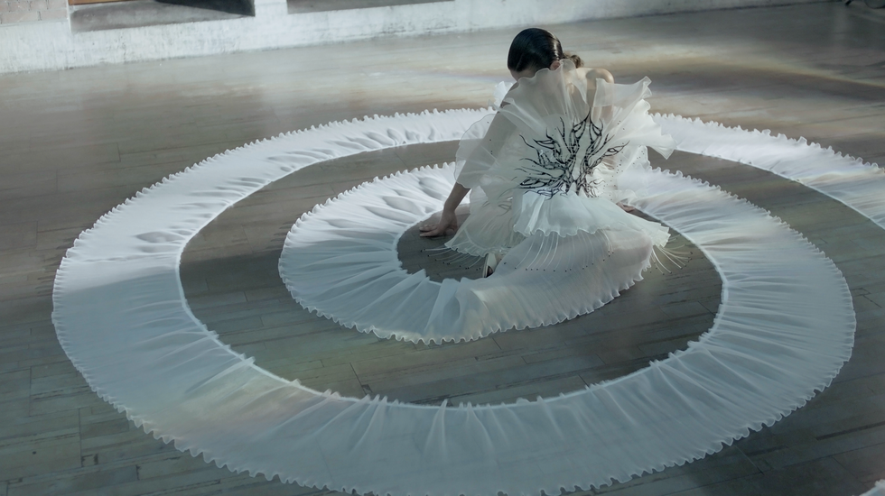 Rather than create an entire collection, Herpen designed just one look and made it the centerpiece of the film. Much like her GoT role, Houten portrays a strong, ethereal character as she shows off the couture confection: a diaphanous bloom of white silk organza with undulated pleated layers, filament strands with black crystal seeds and black satin branches growing from the center.