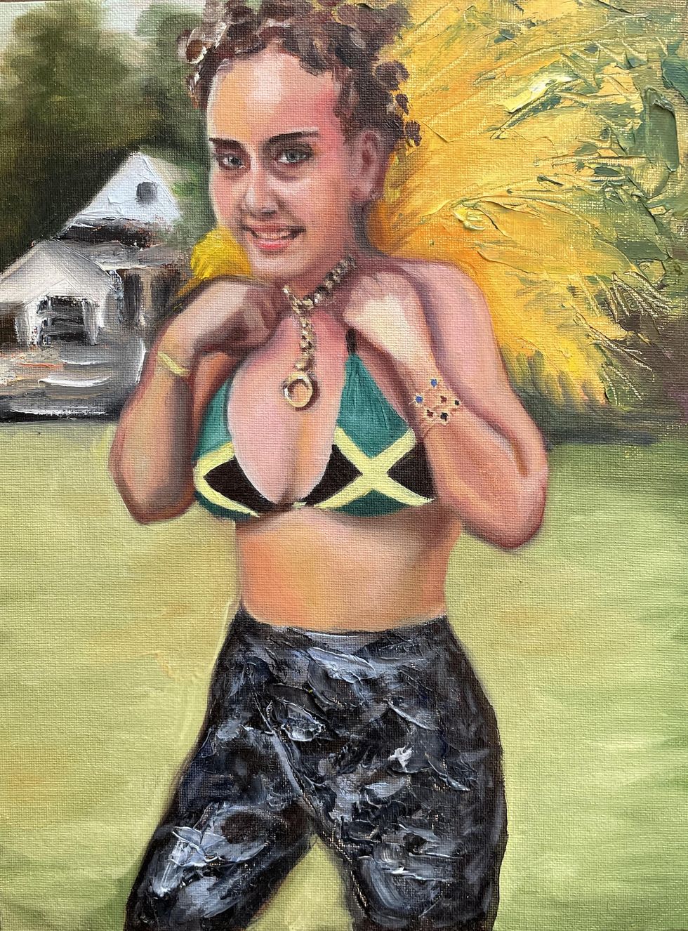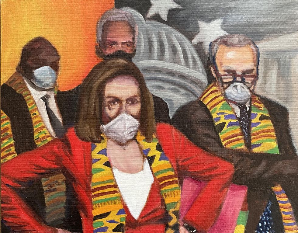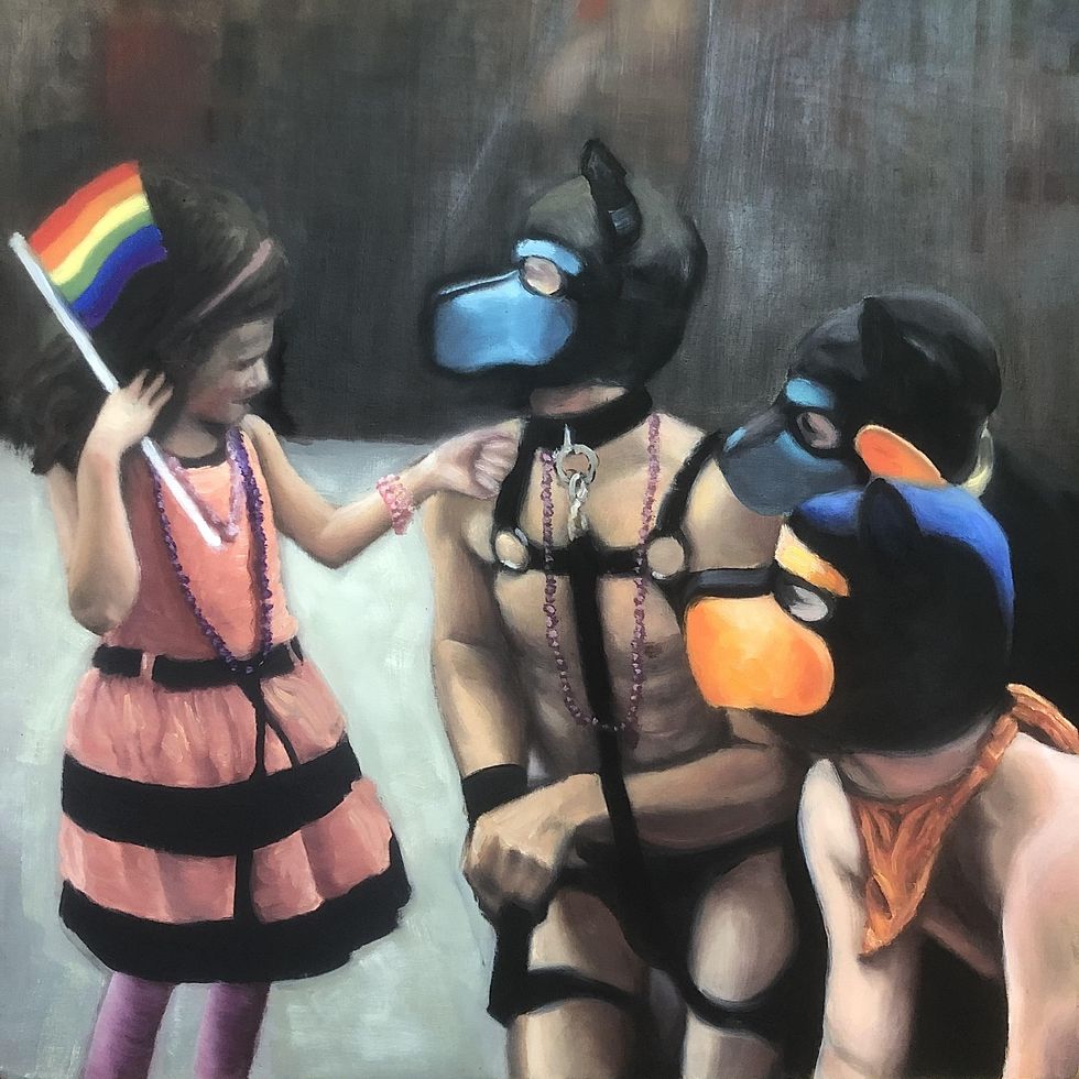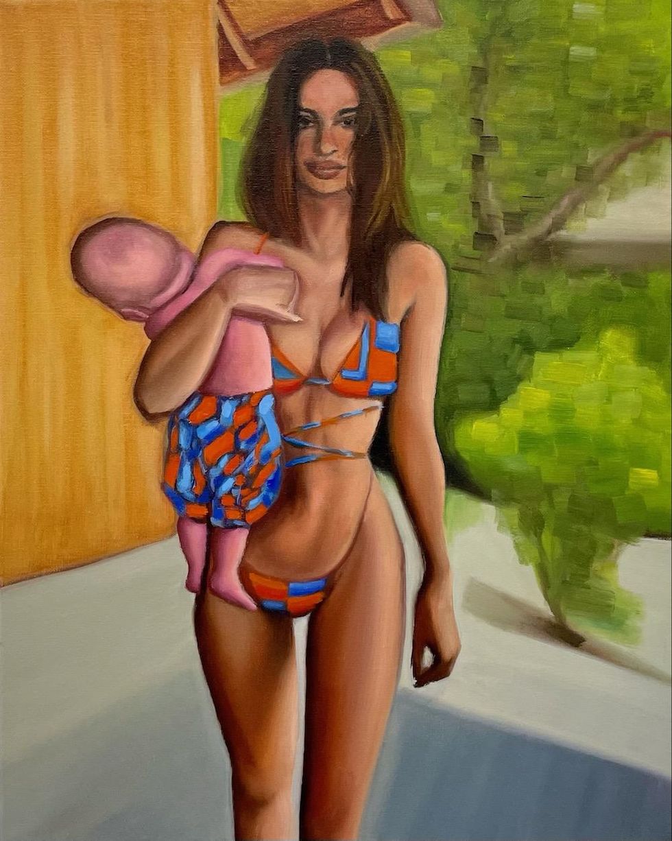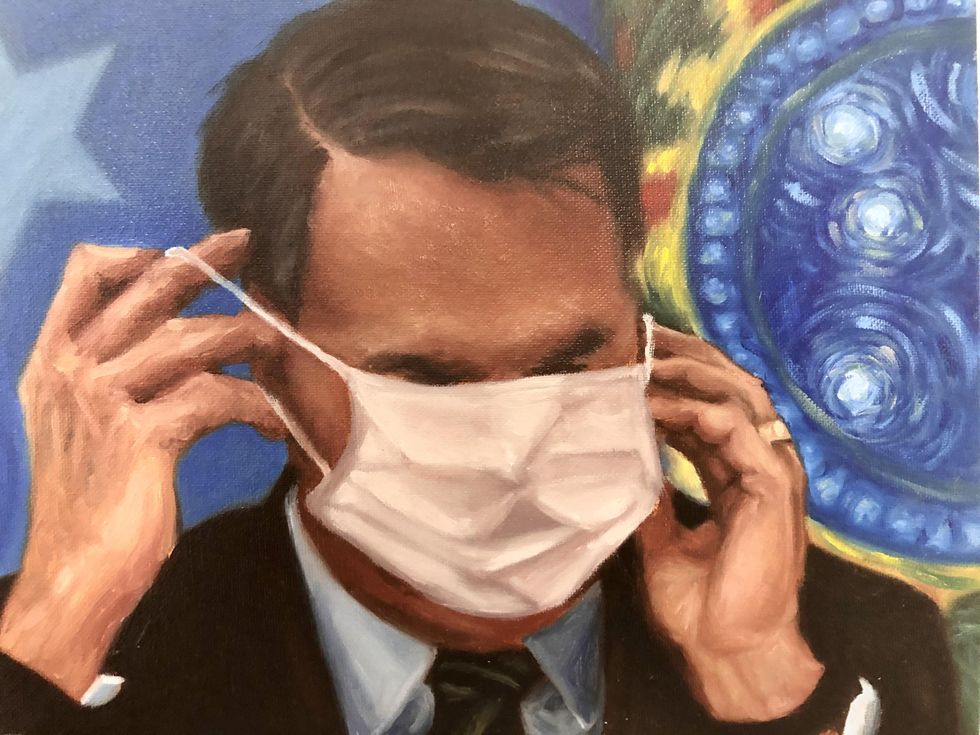 Throughout quarantine, Peifer painted portraits of public figures who captured our fleeting, flattened attention during the last year and a half: celebrities, politicians and otherwise everyday people who'd achieved virality — a term that takes on new meaning in the wake of a global pandemic — at one point or another. (Remember that giant baby?) Cringe is a diary entry of those moments: Gal Gadot, blithely leading an unwanted digital lullaby, hangs alongside Emily Ratakowski as a modern-day Instagram-hot Madonna and child and President Jair Bolsonaro of Brazil, absurdly half-masked in a portrait titled "Todos Nós Vamos Morrer um Dia." Recreating these contemporary figures in the historically stoic medium of oil on canvas, Peifer in turn bestows his subjects with a sort of goofy gravitas. Through quick brushstrokes, they all appear cartoonish and exaggerated, almost grotesque. As Peifer says, "I don't think I was documenting the celebrities themselves. I was documenting this shift in how other people saw them."