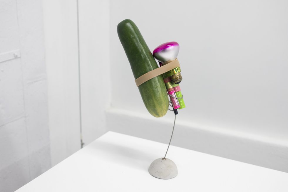 Multimedia artist, character actress, and self-proclaimed "object choreographer" Isaac Pool combines unlikely found objects and materials — pickles, lipgloss, and foil are of the lot — for his vaguely glamorous sculptural oddities.