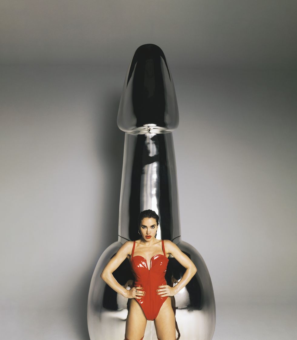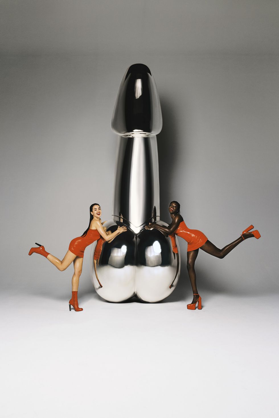In the accompanying campaign by Zhong Lin, initially teased with reality TV-like pixelation around the genitalia, Ffrench and her models apply the product by literally grabbing it by the balls (in addition to modeling for her company, Ffrench does her own makeup for her campaigns, with the help of an assistant who does her skin — she finds it “relaxing being on the other side of the brush”). Lin’s images feature Ffrench frolicking with a specially built 10-foot-tall phallic sculpture; she poses on the testicles like a Sports Illustrated model, embraces the shaft like it’s a husband who has just returned from war. Who among us can’t relate?