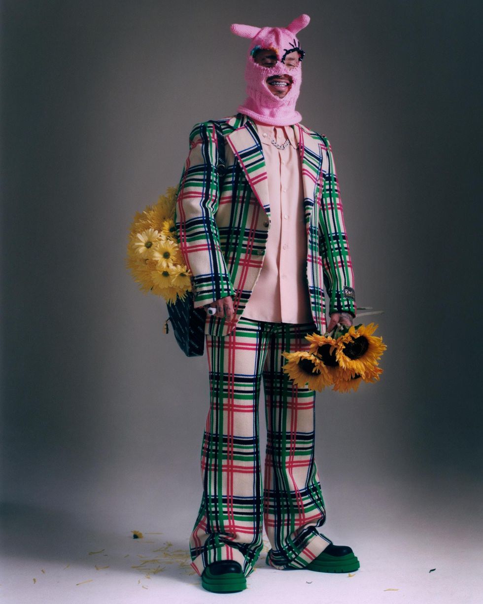 Suit, shirt and bag: Gucci, Mask: Gabrielle Schwan, Shoes: Bottega Veneta