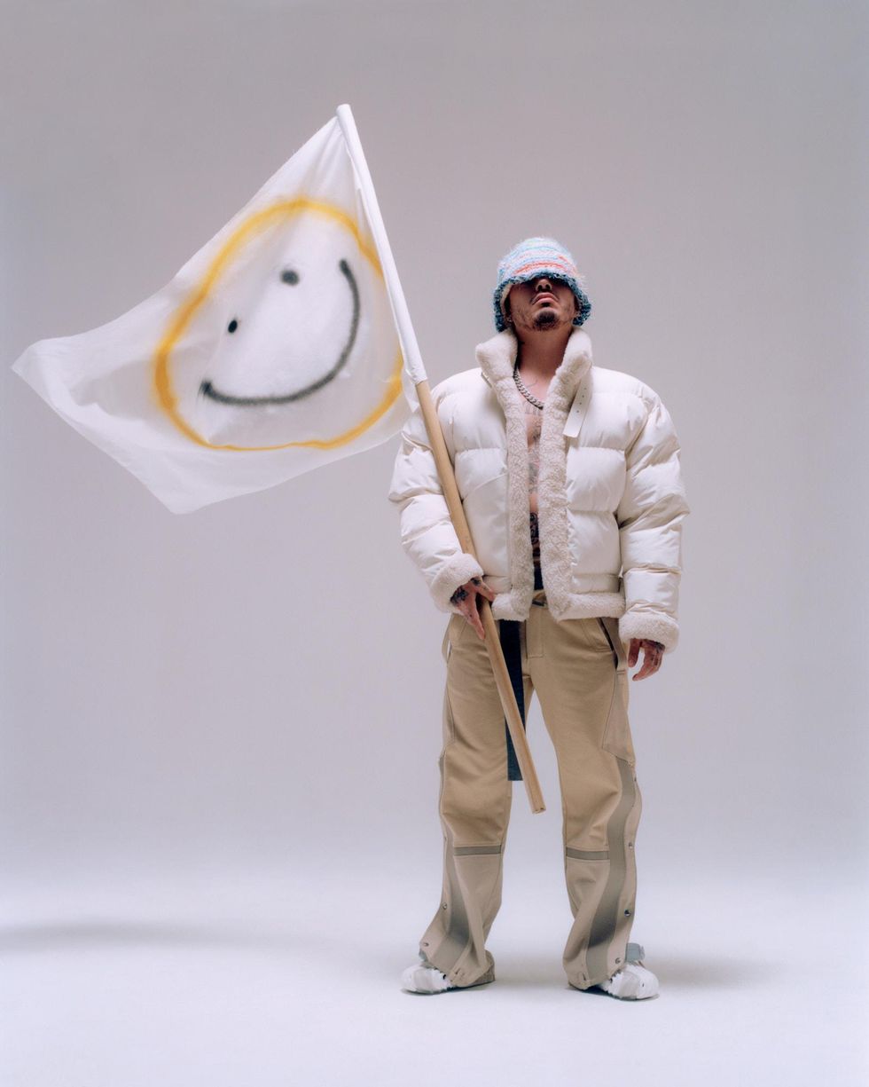 Jacket and pants: Zilver, Hat: Gabrielle Schwan, Jewelry and shoes: J. Balvin's own