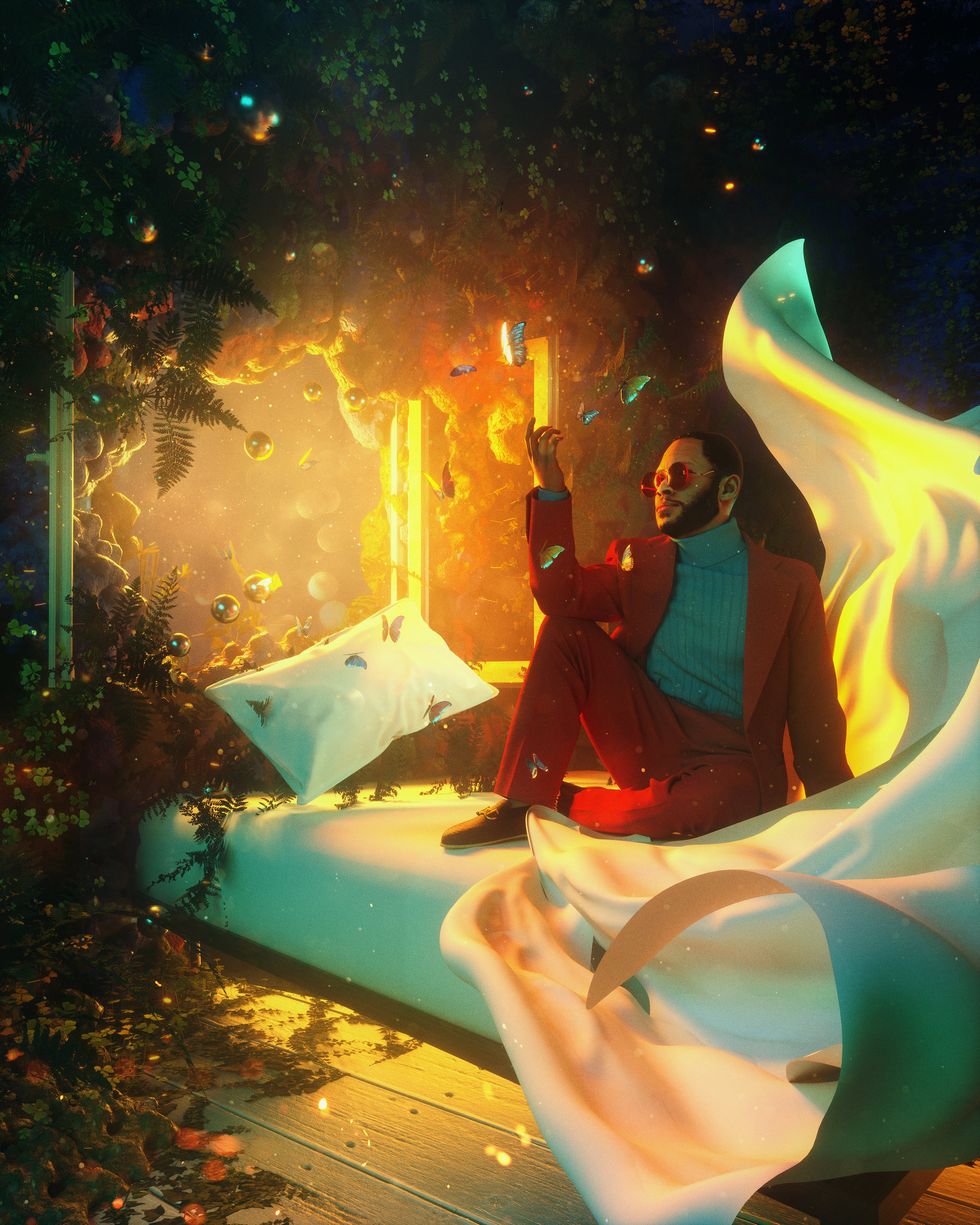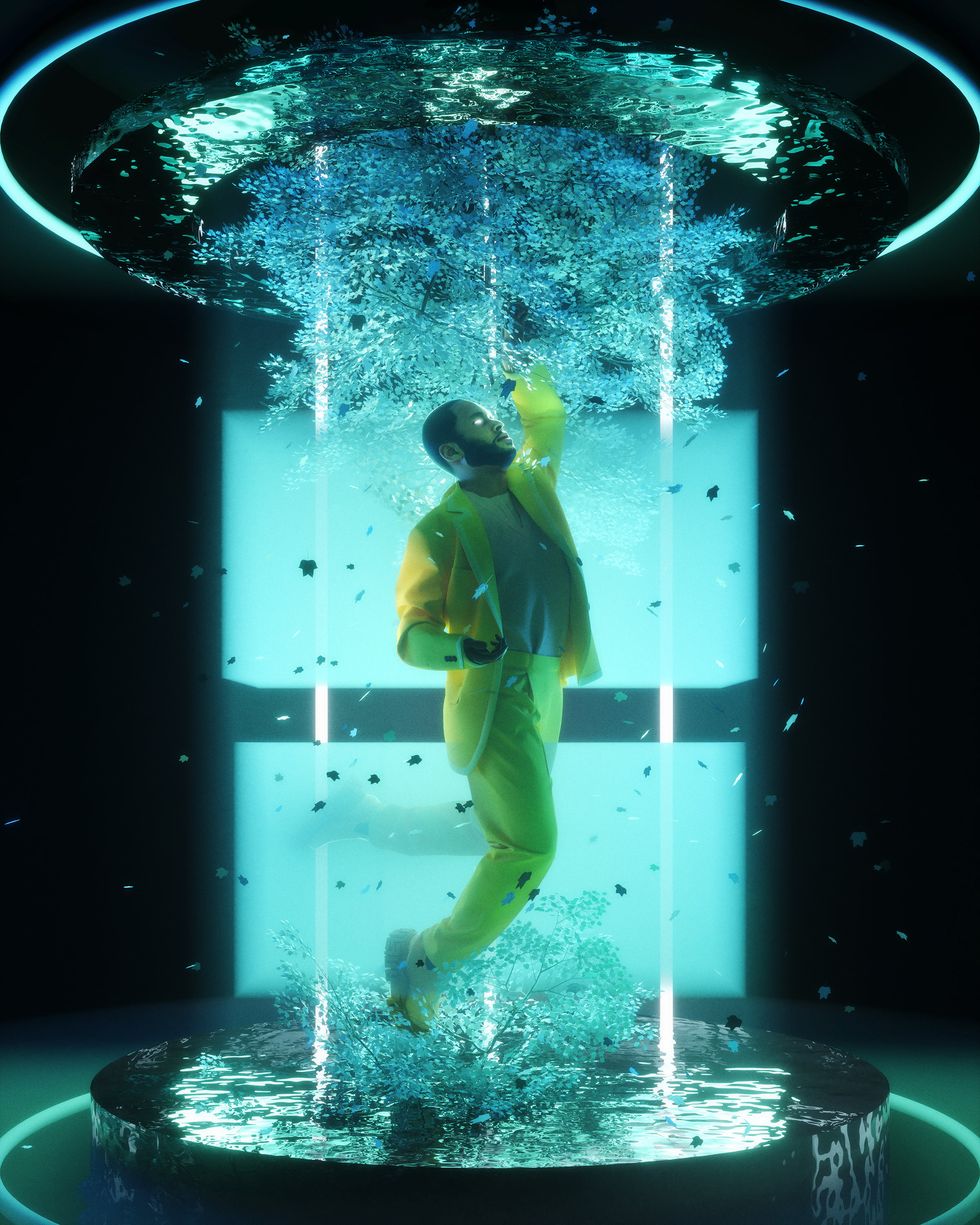 The experimental production began with a Zoom — connecting with each talent over video and talking them through the process of a face/ head scan iPhone app. Once the rough scans were exported, Huynh went back in to fine-tune facial details, humanizing the rudimentary imagery. Alongside subjects' features, Huynh's team sculpted digital bodies posing talent into positions that would match their unique environments, which were also digitally made by hand.