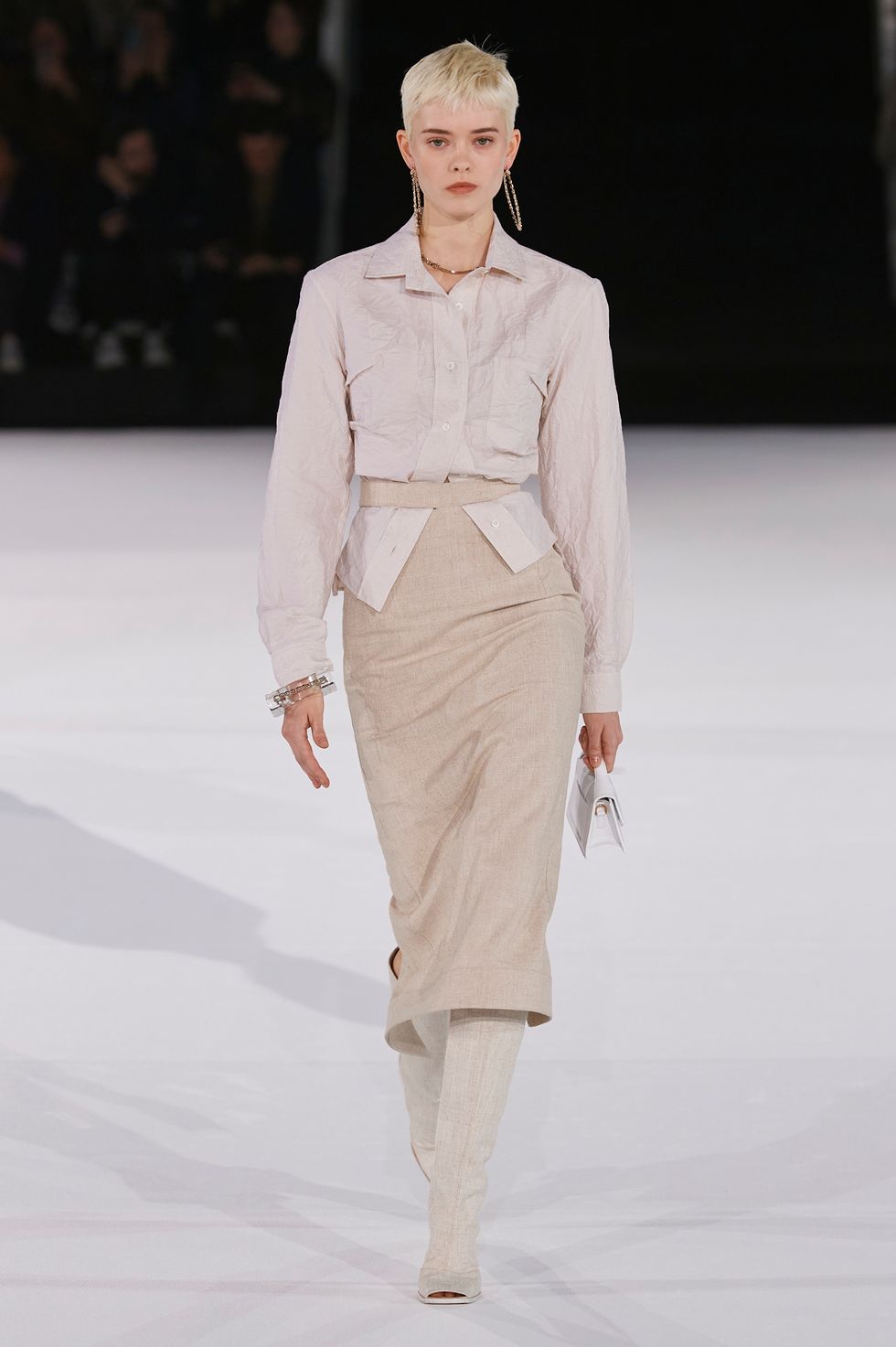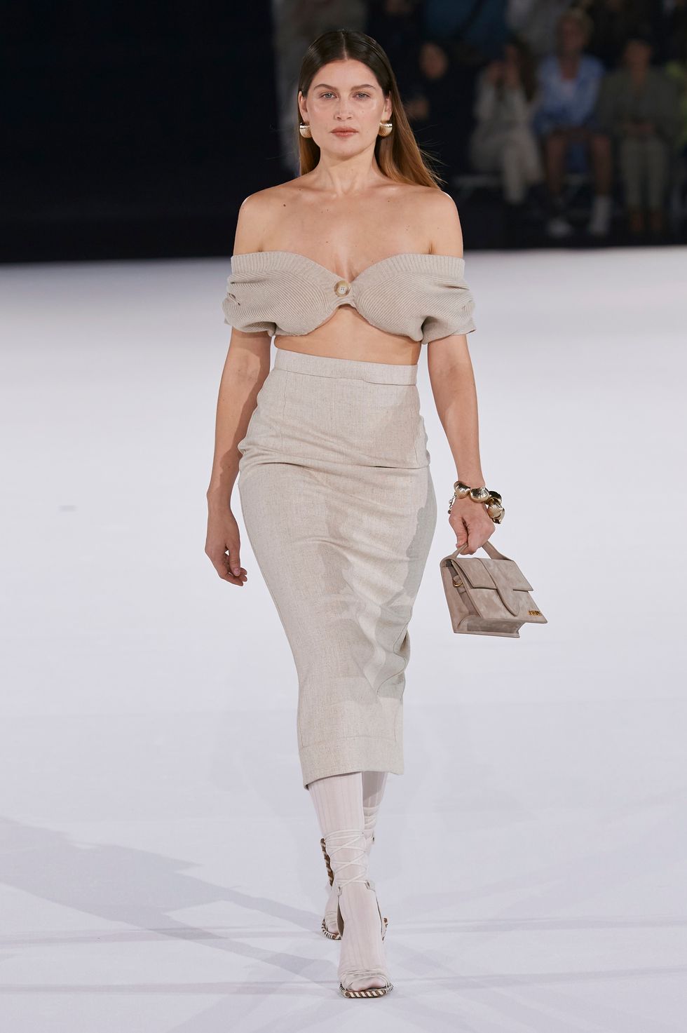 That skirt he made for Valerie (his mother) formed the basis of the collection, starting with the aforementioned look worn by Casta: a linen pencil skirt in a muted shade of beige, the material of which was incorporated throughout. (She paired it with an off-the-shoulder knit bandeau, adding a seductive element to the otherwise humble color palette and fabric choice.) Iterations of the women's ruched halter tops with thigh-high slits from past collections appeared again this season, as did their signature oversized blazers and versions of their best-selling micro bags.