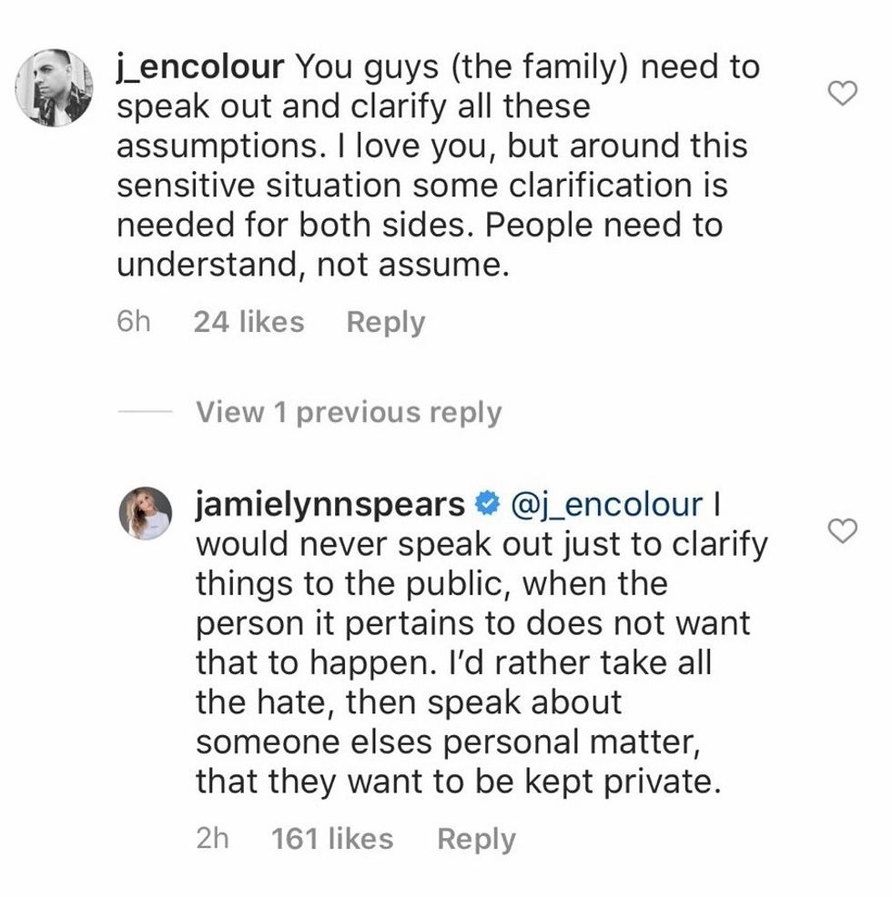 Then in response to another user imploring her to "clarify all these assumptions," Jamie Lynn explained that she "would never speak out just to clarify things to the public, when the person it pertains to does not want that to happen."