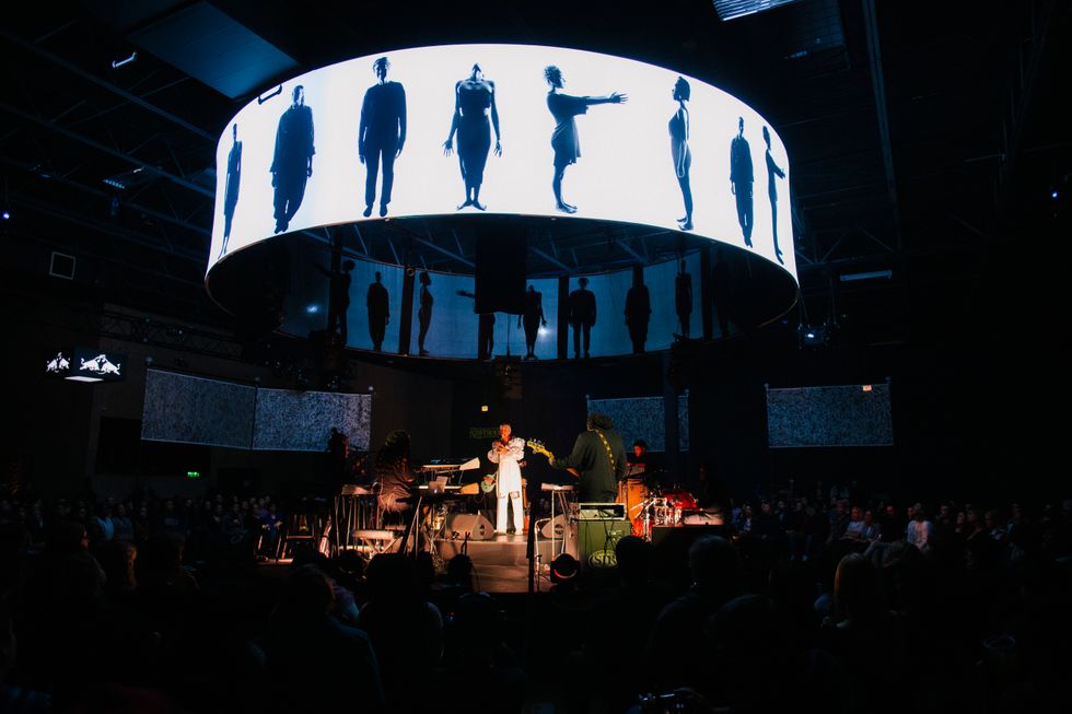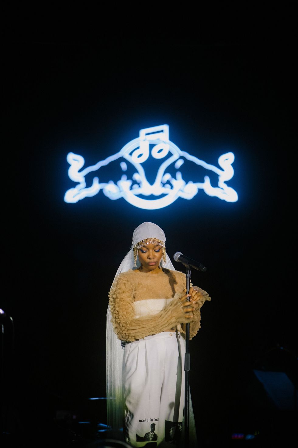As if to illustrate the endless and numerous facets of Blackness in real time, Woods staged her Red Bull performance in the round. Her five-piece band and three backing vocalists surrounded Woods in the center. Visual projections by VAM Studio were similarly organized above the stage, showing archival videos of Jean-Michel Basquiat avoiding an interviewer's probe on what makes him angry, and Eartha Kitt laughing wildly at the idea of compromising herself for the love and validation of a male. These served as introductions and inspirations for Woods' music.