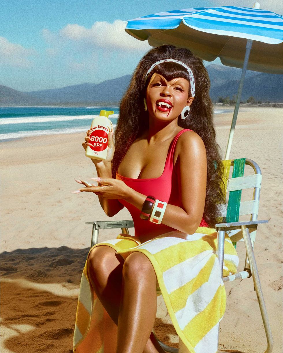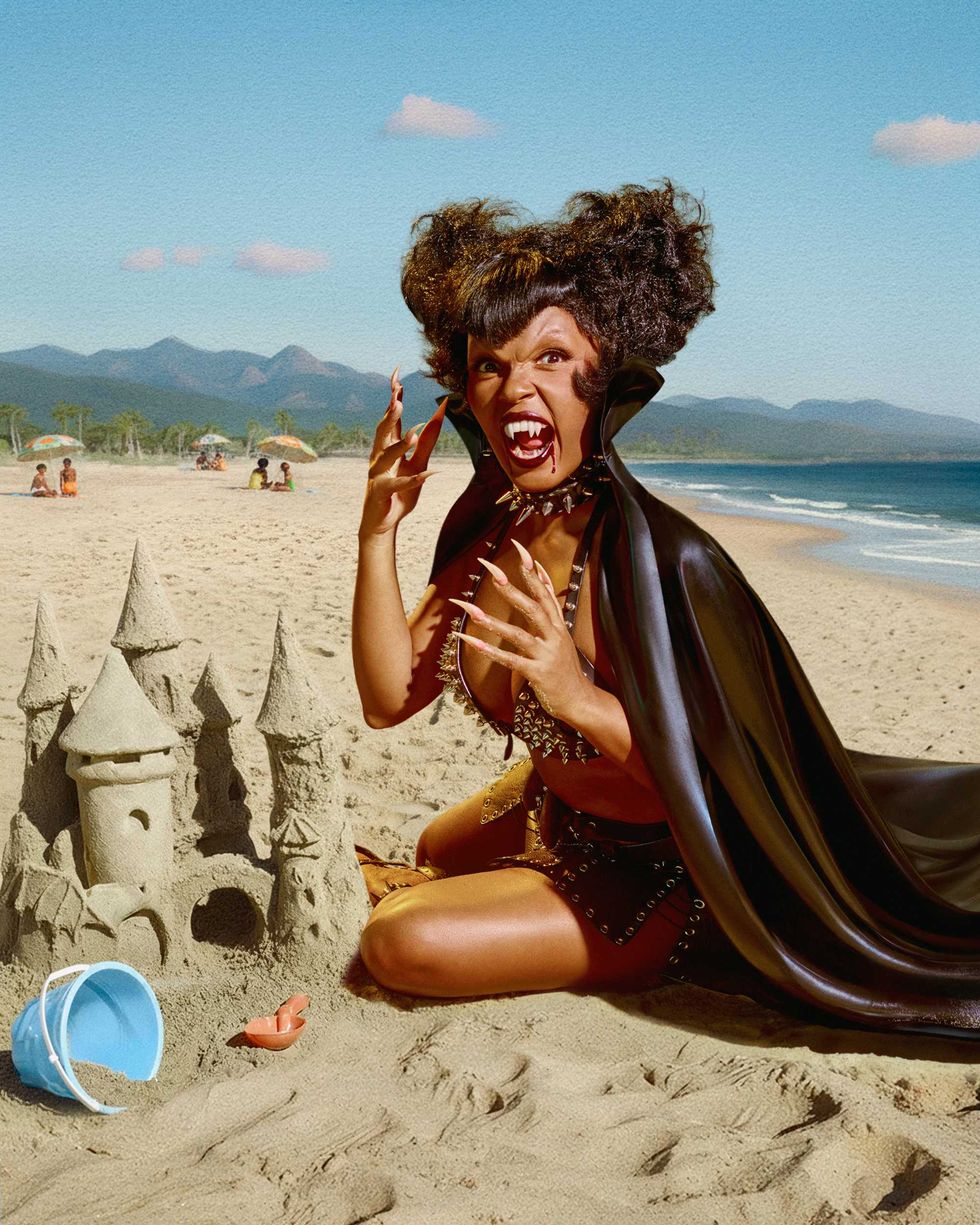 For this month’s cover, Monáe channels that energy literally: a vampire on vacation. Shot on a sandy set strewn with beach chairs and fake blood, she lounges under a “No Vampires on Beach” sign with a crimson drink in hand. It’s part horror, part fashion fantasy. The shoot serves as a preview for Wondaween, an inaugural Halloween festival on October 30th in Los Angeles curated by Monáe and her wonderfully weird crew of creatures. Like, imagine this if a vampire wasn’t allergic to the sun. That’s what she was going for here.