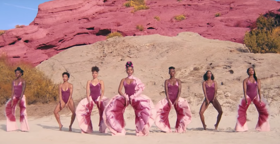 The multi-talented Janelle Monáe shook the Internet to its core this week with the drop of new visuals for her upbeat, bubblegum-pop track "Pynk" off her forthcoming Dirty Computer. Hailed as a "queer masterpiece," the Emma Westenberg-directed video featured Monáe and a cabal of beautiful women dancing to the Grimes-assisted track in a pink-hued desert, in a pink-neon lit roadside diner, in a pink-colored bedroom and riding in a pink convertible. Monáe recently told Zane Lowe in an interview that Dirty Computer will be an "extremely vulnerable" album, and this video felt both psychedelic, celebratory and a little punk in its visual exploration of female sexuality. Notably, Monáe and her dancers wear eye-popping, vulva-shaped pink pants that open up just like the real thing.