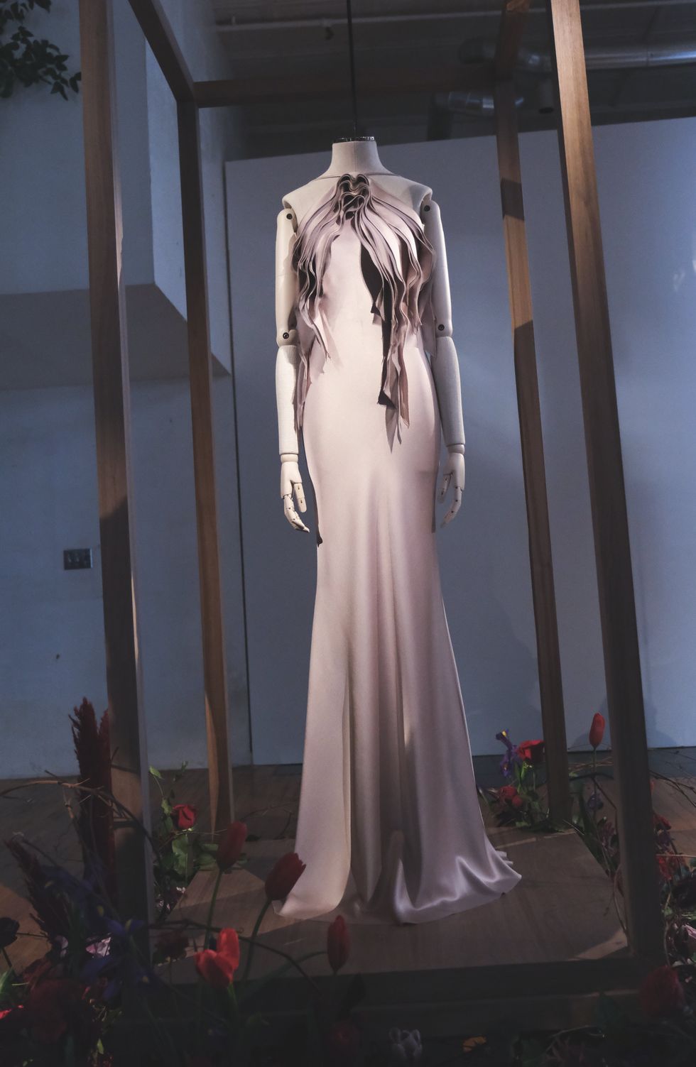 A few of the gowns from the fall 2019 collection were simple in nature aside from elegant, intricate pleats. Whether seen as accents on the tops of the necklines or in the firm of frills from neckline to hem, the quintessential pleated details were a highlight of the collection.