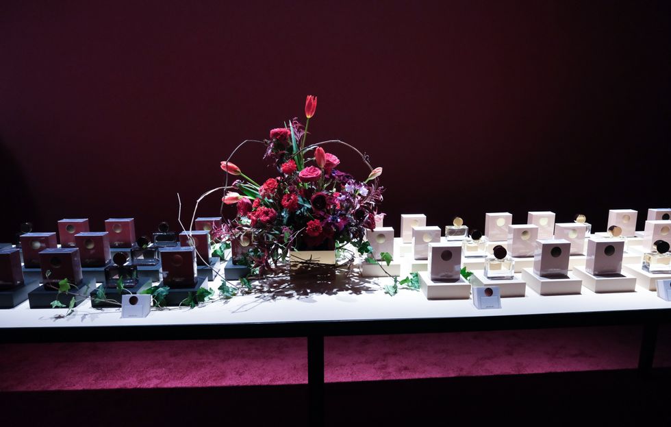 Jason Wu has worked with the florists Putnam & Putnam for years. Given this was a fashion presentation that had such a strong link to scent and flowers, specifically the rose, the two partnered again this season. Putnam & Putnam's floral installations (a sea of moody black, red and deep maroon blooms which corresponded with the collection's color palette) surrounded the mannequins and the perfume displays.