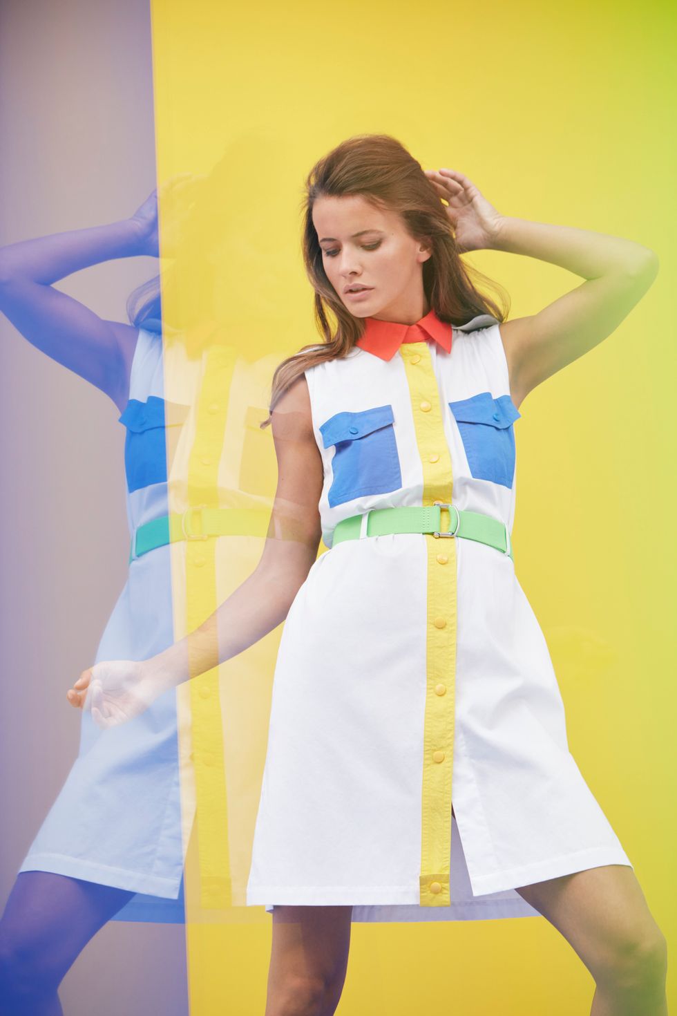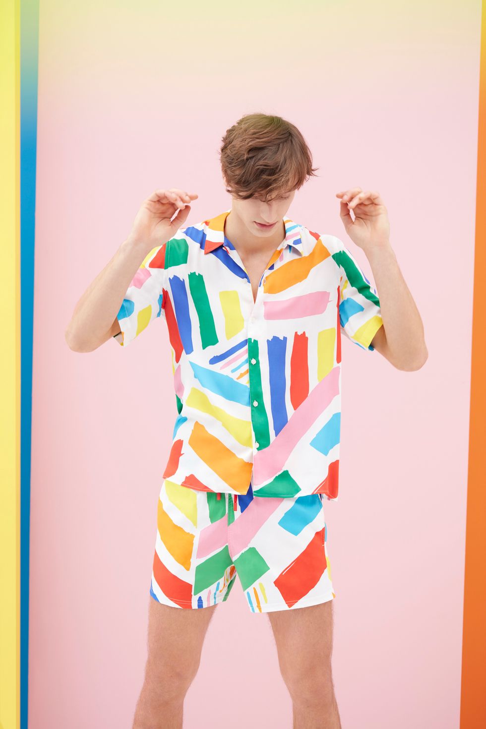 Besides the rainbow pieces, the Vilebrequin collection's standout is without a doubt a $280 leopard-print one piece that features a bold teal bandeau in place of the rainbow one on the black suit. The leopard print is fairly plain, but small shocks of color are parsed between black half circles for a uniquely Castelbajac touch. The men's pieces are just as vibrant, if not brighter; a dazzling $170 short sleeve button-up is the men's collection capstone. It features a scattering of bold blocks of color, stacked beautifully on the white viscose. "This collection, I find, is a glam-pop," he says of the various summery pieces. "Now I feel it is time to bring back something fresh, something about naïve, something about utopia time."