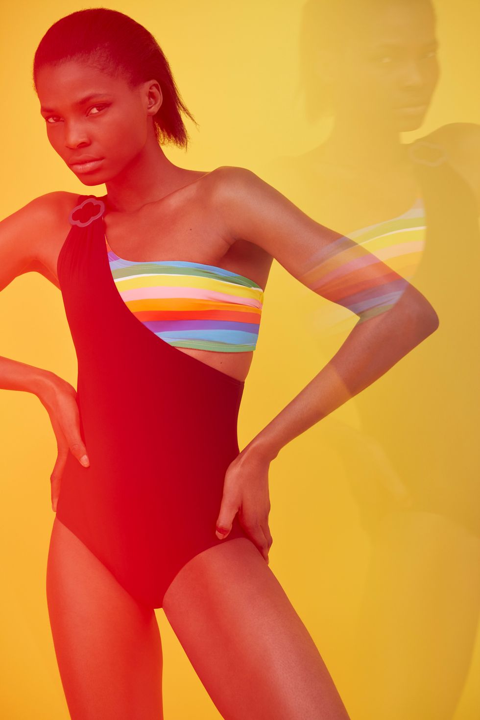 The collection is incredibly colorful by Vilebrequin's standards, with pops and swatches of rainbows littering each garment. This is not to say, of course, that a camp aesthetic is limited in this case to colors which might signal some sort of parody or illusion; the garments are indicative of a new movement within swimwear to innovate what has become a tired silhouette. This can be seen especially in an asymmetrical one piece swimsuit that's included in the collection, and retails for $280. Draping black stretch fabric is broken up by a rainbow bandeau — a concept that's also replicated in the design of the collection's beach towel, which retails for $135.