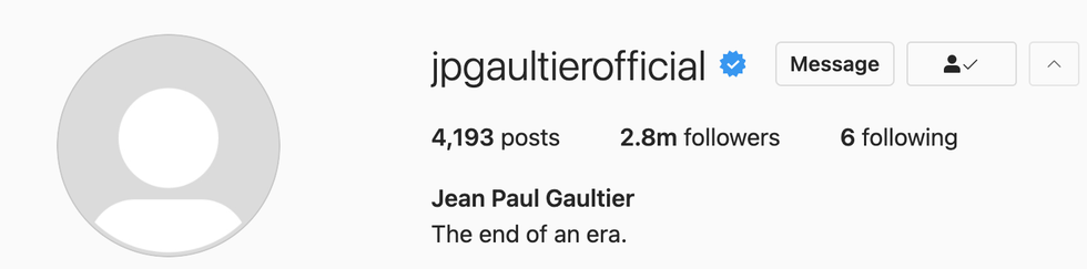 First, he wiped his profile picture clean and set it to default. Then he uploaded a cryptic post with the words "The End" in bold font alongside the brand's logo, which really sent users into a frenzy. Finally, he changed the company's Instagram bio to "the end of an era," hinting at a possible termination of sorts. But is Jean Paul Gaultier really over?