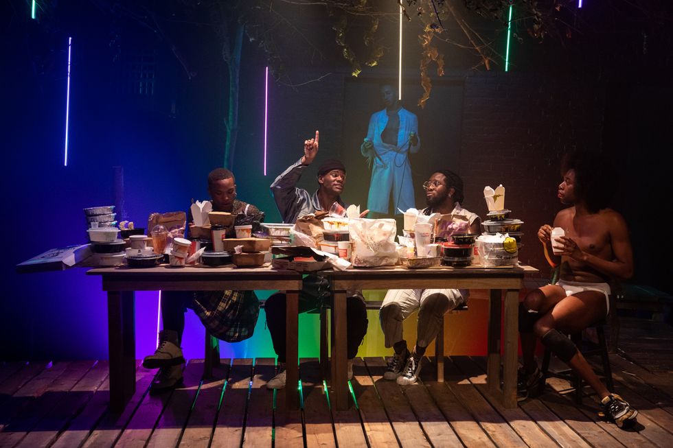 "One of the reasons that Michael Johnson is a character is because he represents something that's frightening about the Black body and HIV," Harris explains. "The fact that his actual sexuality was criminalized is crazy to me and part of what stopped me from being sexual for so long." The play also references queer artists like Kathy Acker, Yukio Mishima, and Samuel Delany, employing them as the blueprints for various characters. Harris says he's working within their canon: "I wanted people to be able to say 'Oh, Jeremy isn't trying to be a provocateur, he's referencing [these other writers.]'"