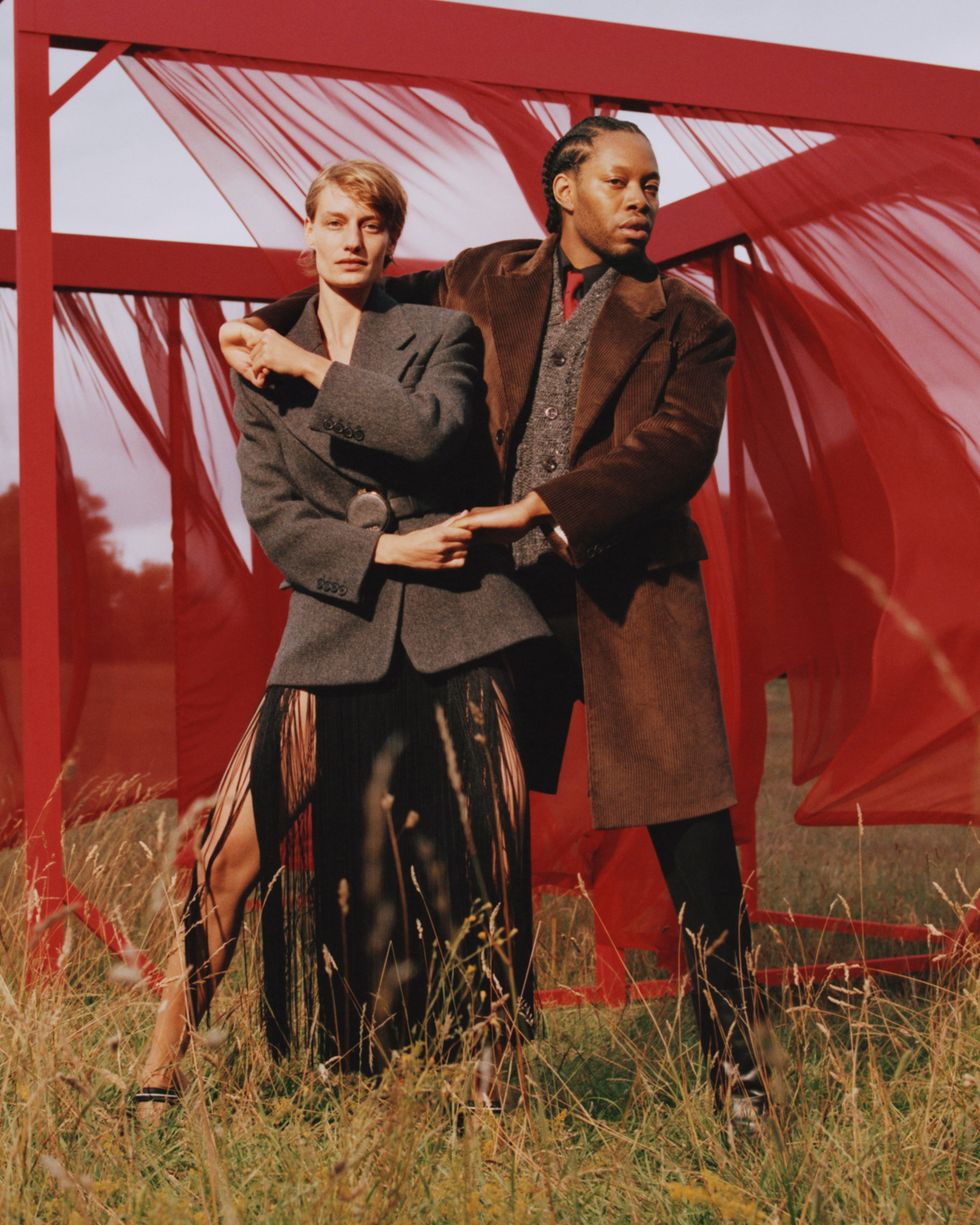 It's just the second major campaign Harris has starred in after teaming up with his Slave Play cast for a Helmut Lang video project last year. In the Farfetch images, Harris dons full runway looks from the collections of brands like Prada and Raf Simons set against an outdoor, grassy field.