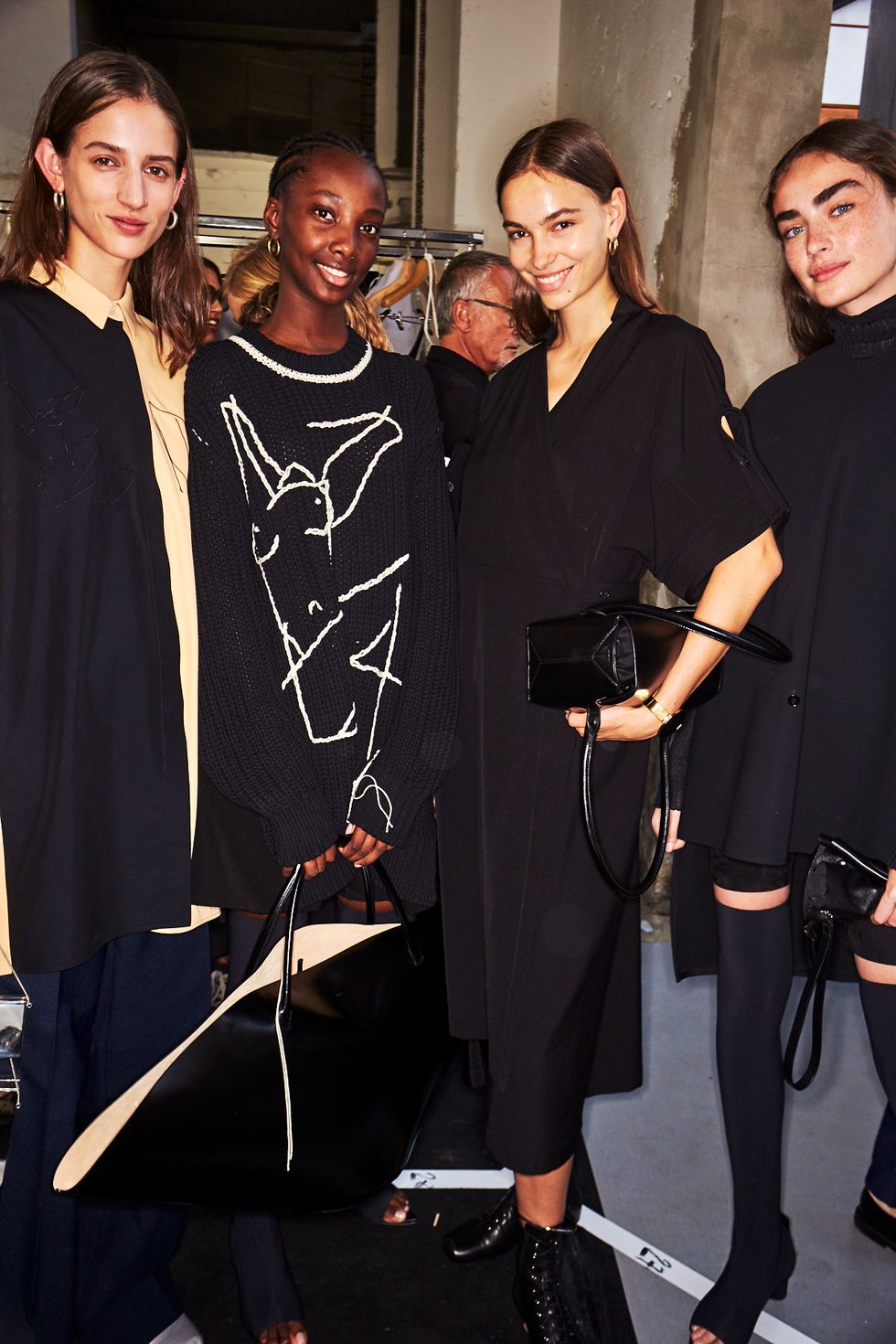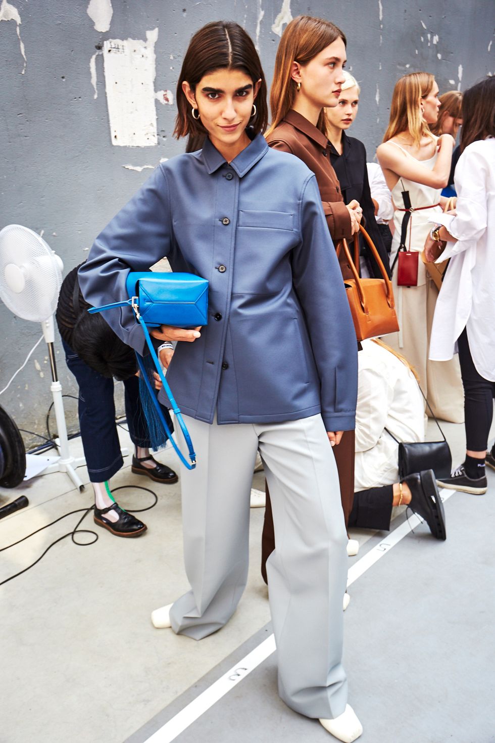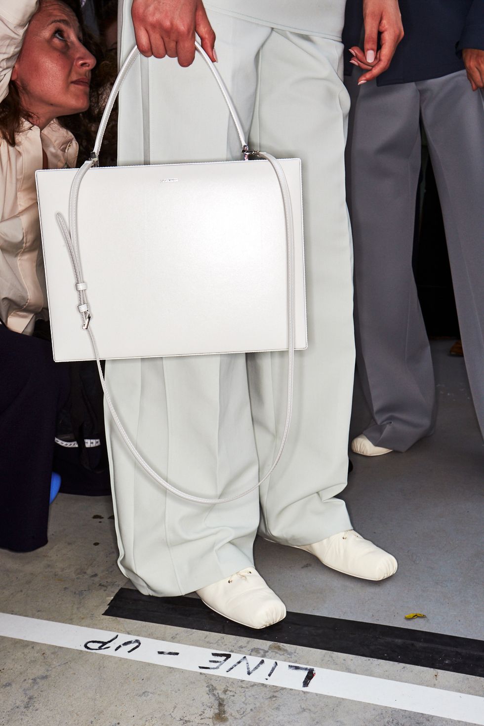 Models gripped handbags the size of their torsos at the waist and had mini coin purses and billfold wallets slung around their wrists and waists. The stark contrast in size was bridged by rectangular box bags and briefcases.