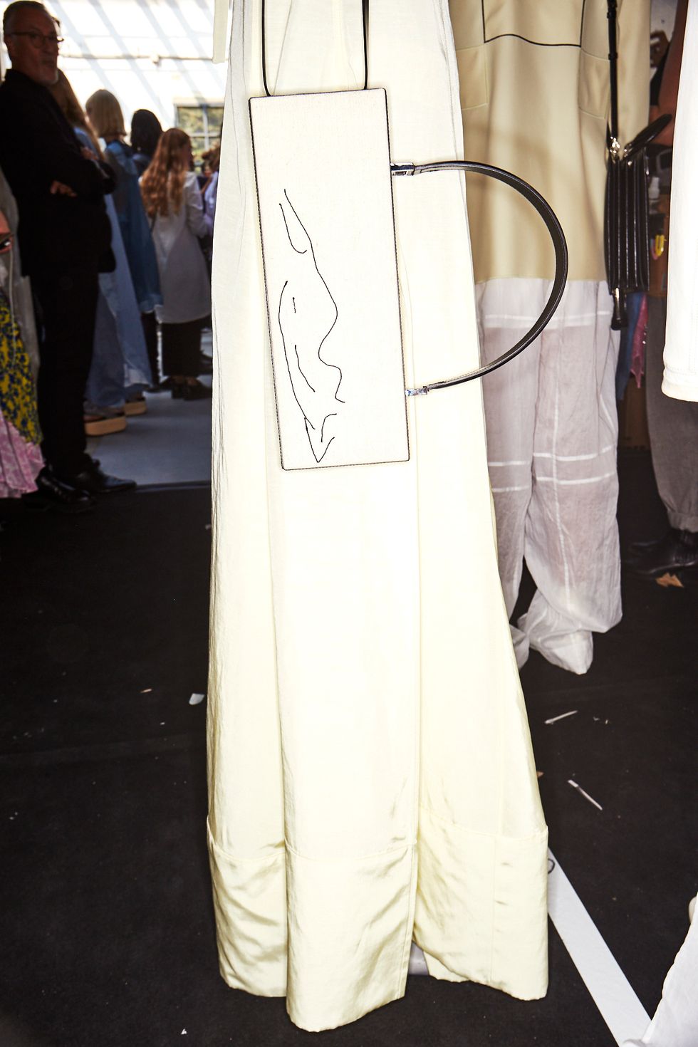 The husband and wife design duo applied an illustration of an abstract female character to knitwear, handbags, handkerchiefs, and button-down shirts. Depicted twisting at her waist and with her head slung bag, the figure brings dynamism to the Meiers' angular silhouettes.