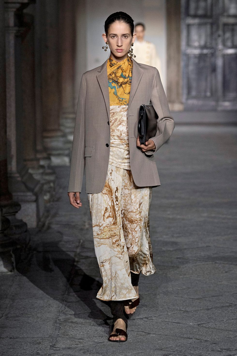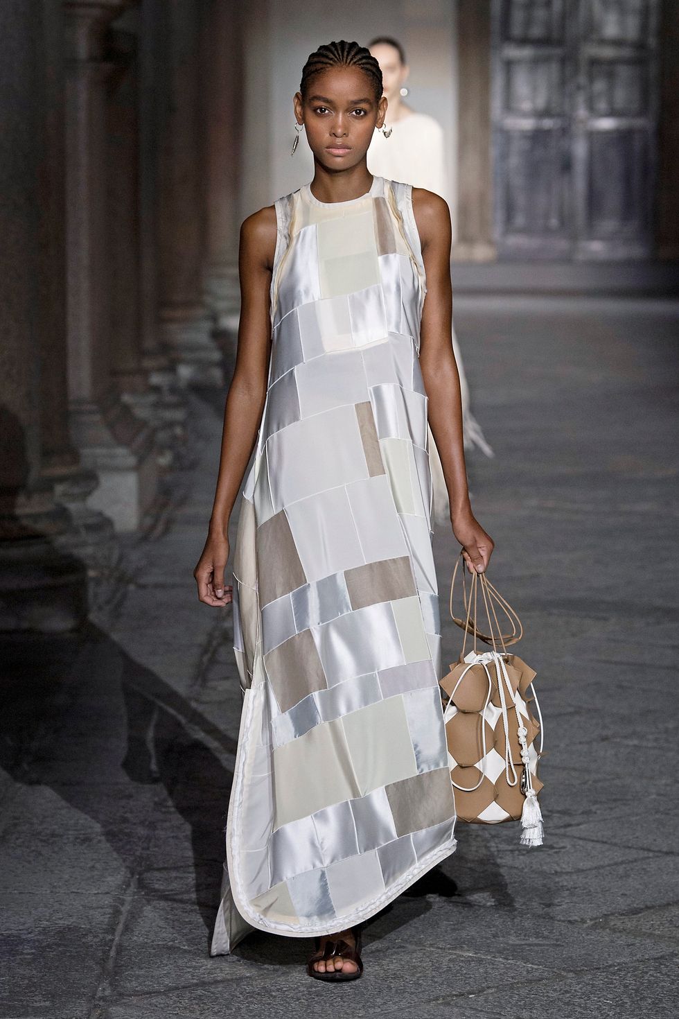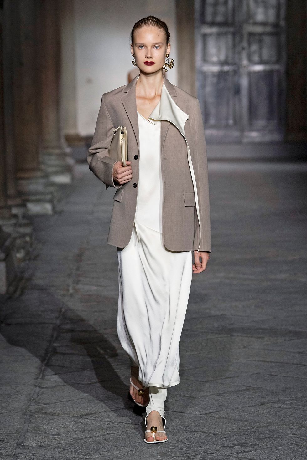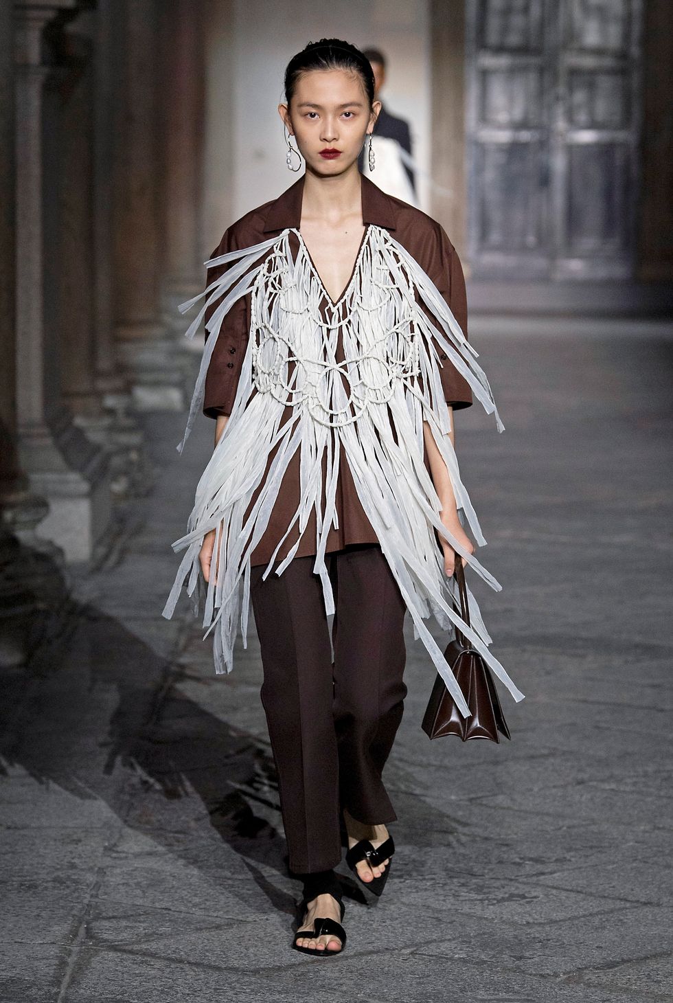Since taking the reins at Jil Sander two years ago, power couple Luke and Lucie Meier have managed to honor the founder's minimalist legacy while adding their own unique sensibilities to the Italian luxury brand. For Spring 2020, the designers championed a warmer mood, with personal touches and flourishes like raffia fringe and soothing prints. That tension between hard and soft was seen in various looks, with fluid tunics and bias-cut dresses worn with sharp tailoring in a black and white palette.