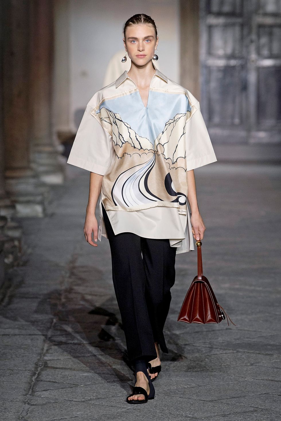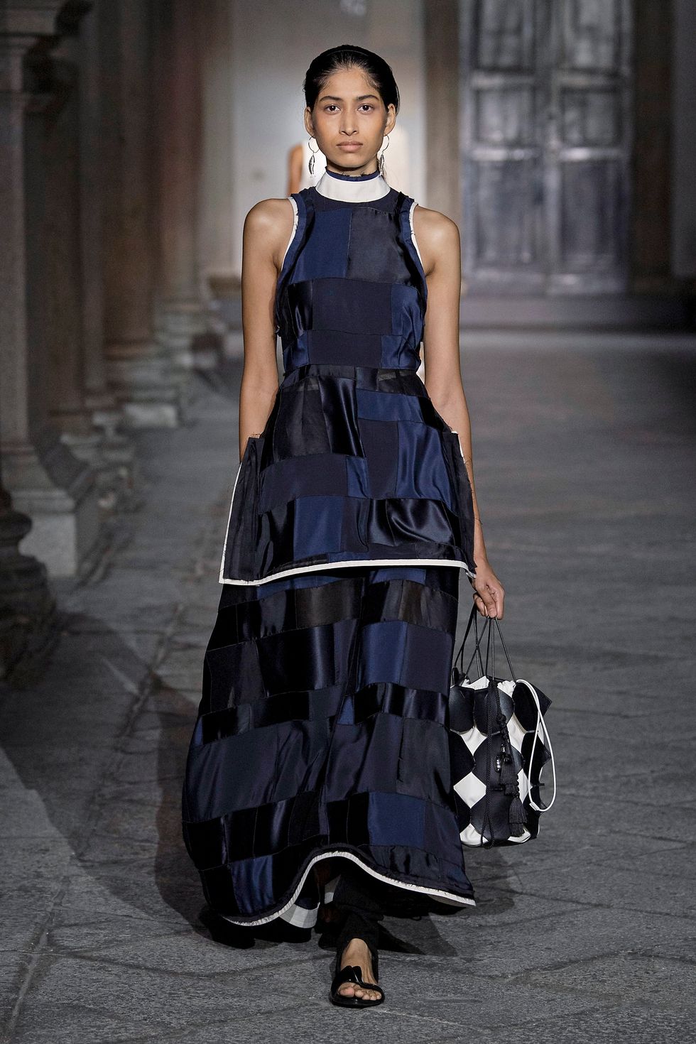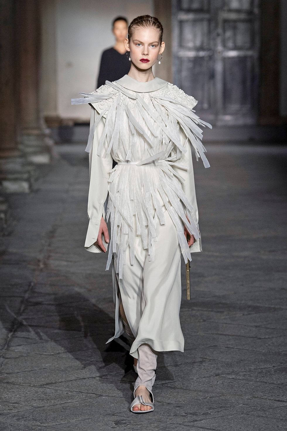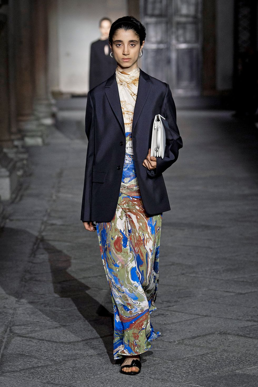 Since taking the reins at Jil Sander two years ago, power couple Luke and Lucie Meier have managed to honor the founder's minimalist legacy while adding their own unique sensibilities to the Italian luxury brand. For Spring 2020, the designers championed a warmer mood, with personal touches and flourishes like raffia fringe and soothing prints. That tension between hard and soft was seen in various looks, with fluid tunics and bias-cut dresses worn with sharp tailoring in a black and white palette.