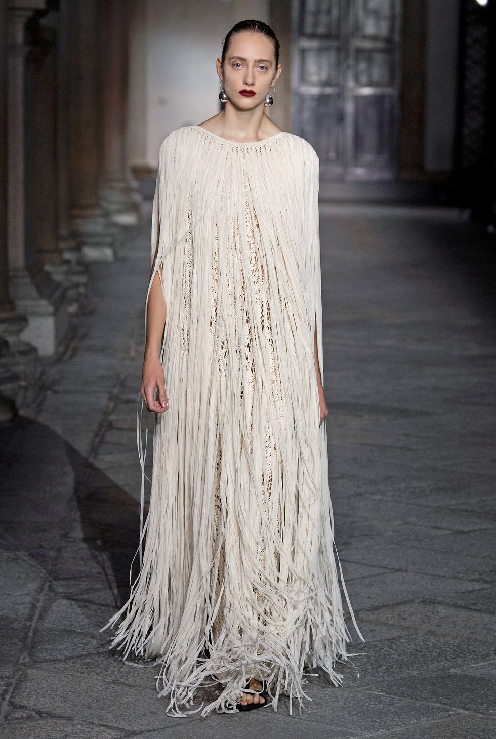 Raffia fringe decorated shirts and dresses in a home-spun, crafty manner. It also formed an entire floor-length dress in a muted cream color.